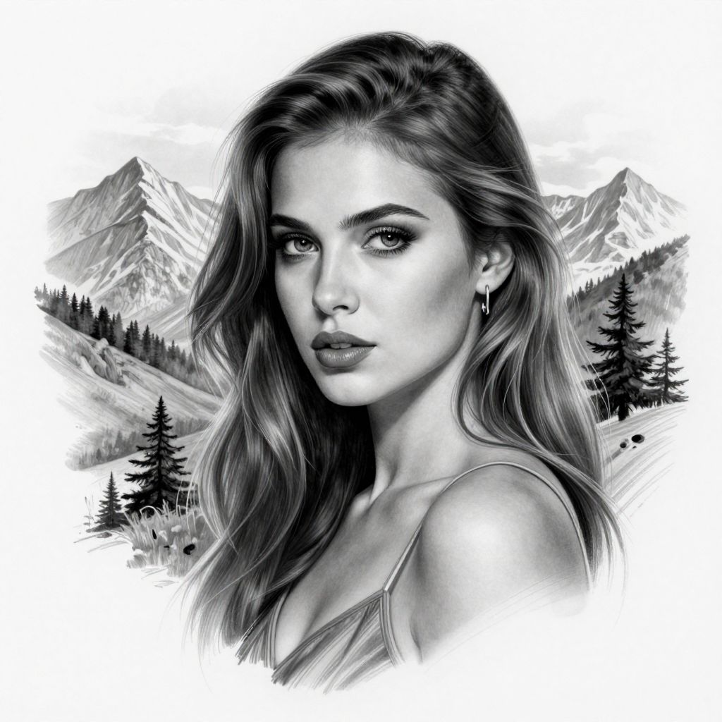 Monochromatic digital drawing of a beautiful woman with wavy hair, looking over her shoulder, set against a snowy mountain landscape with evergreen trees.
