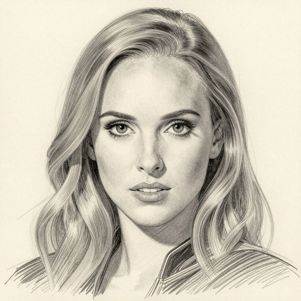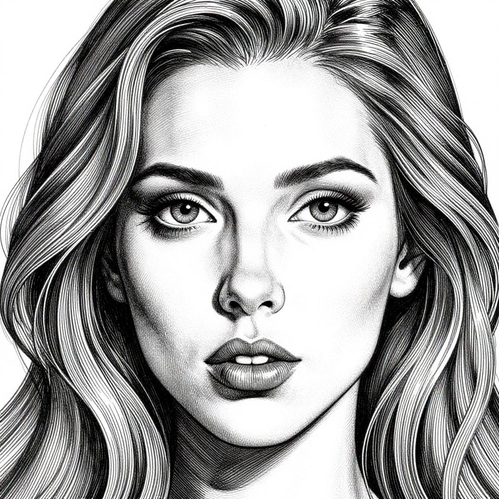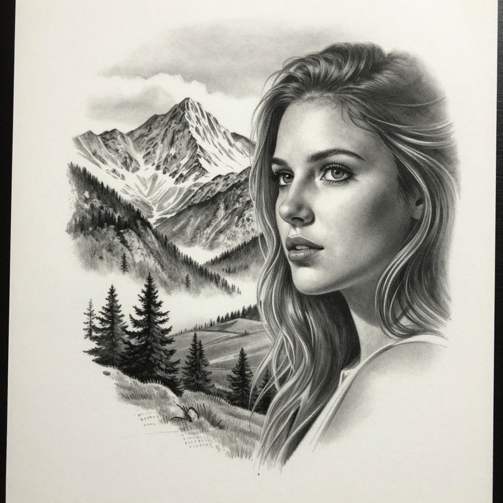 This is a black-and-white digital drawing in a realistic style. The image features a close-up of a young woman with long, wavy hair and delicate facial features, gazing intently to the right. Her expression is calm and thoughtful. In the background, there is a detailed mountain landscape with snow-capped peaks and dense evergreen trees. The mountains are sharp and textured, contrasting with the smooth, soft texture of the woman's face. The monochromatic color scheme emphasizes the intricate details and shadows. The woman is positioned on the right side, with the mountainous scenery occupying the left side of the composition.