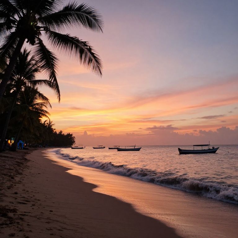 Photograph of a tranquil beach at sunset. Silhouetted palm trees frame the left side, casting shadows on the golden sandy shore. The sky transitions from deep purple to vibrant orange and pink hues. Gentle waves lap at the shoreline. Several small, wooden fishing boats float on the calm water, anchored near the shore. The sun is partially hidden, casting a warm, pinkish glow across the scene. The right side shows the horizon where the sky meets the ocean, creating a serene, picturesque atmosphere.