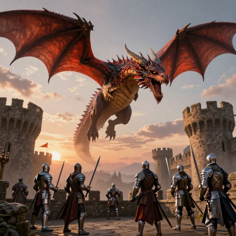 Photorealistic digital artwork depicting a dramatic medieval battle scene. A massive, red-scaled dragon with outstretched wings and sharp claws looms overhead, preparing to attack. Below, seven armored knights with helmets, chainmail, and red cloaks stand in a defensive circle, holding swords. The background features tall, stone castle towers with flags, bathed in the warm, orange glow of a setting sun. The sky is partly cloudy, adding to the intense atmosphere. The ground is cobblestone, and the overall scene is filled with tension and impending conflict. The image balances detailed textures and dynamic lighting, emphasizing the dramatic moment.