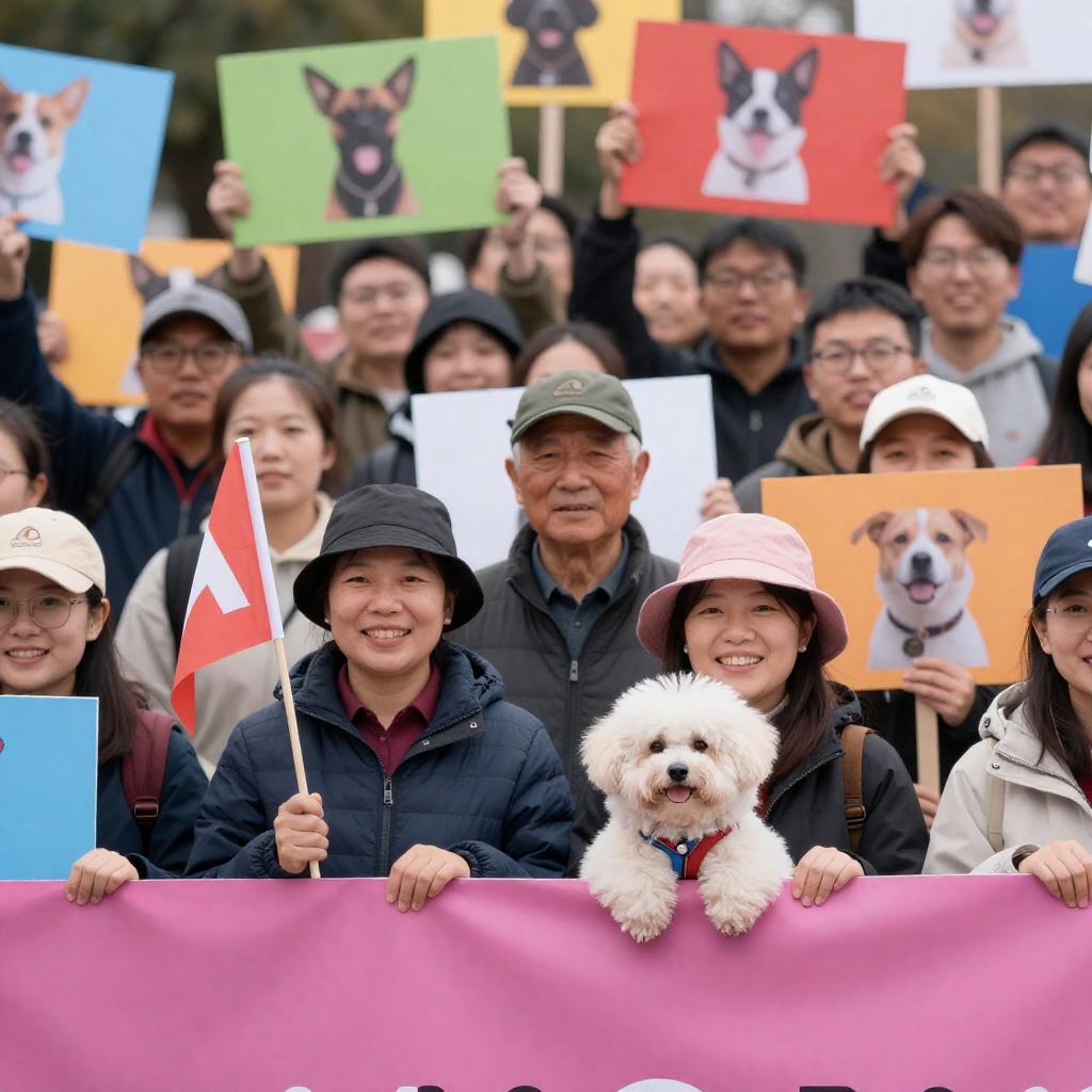 Crowd of diverse people, mostly smiling, holding colorful signs and flags with dog images. Central older man in green hat. Woman with pink hat and fluffy dog in front. Bright daylight. Pink banner in foreground. Approximately 20 people.