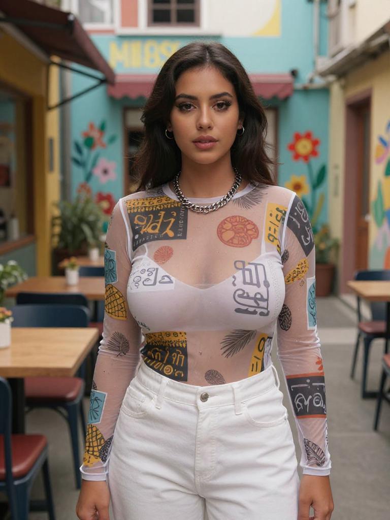 A Willowy woman in streetwear, wearing a sheer long-sleeve mesh top with bold graphic prints and high-waisted white jeans, accessorized with a chunky silver chain necklace, captured in the vibrant visual style of ib technicolor film stock, standing in a charming alleyway adorned with colorful murals and quaint cafes. Sexy. Pretty face and beаutiful eyes. Big breasts