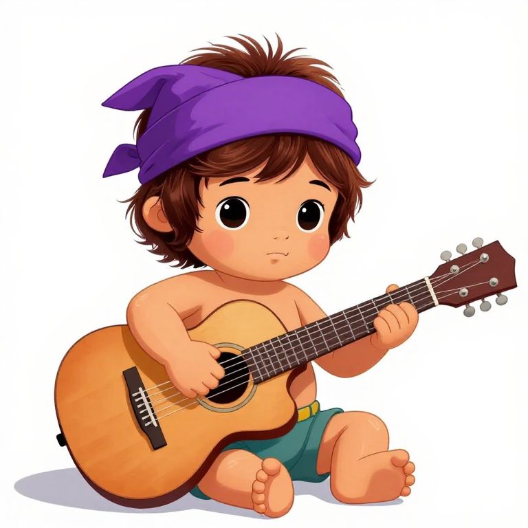 Digital illustration of a chubby, shirtless toddler with brown hair, wearing a purple headband, playing an acoustic guitar, sitting barefoot.