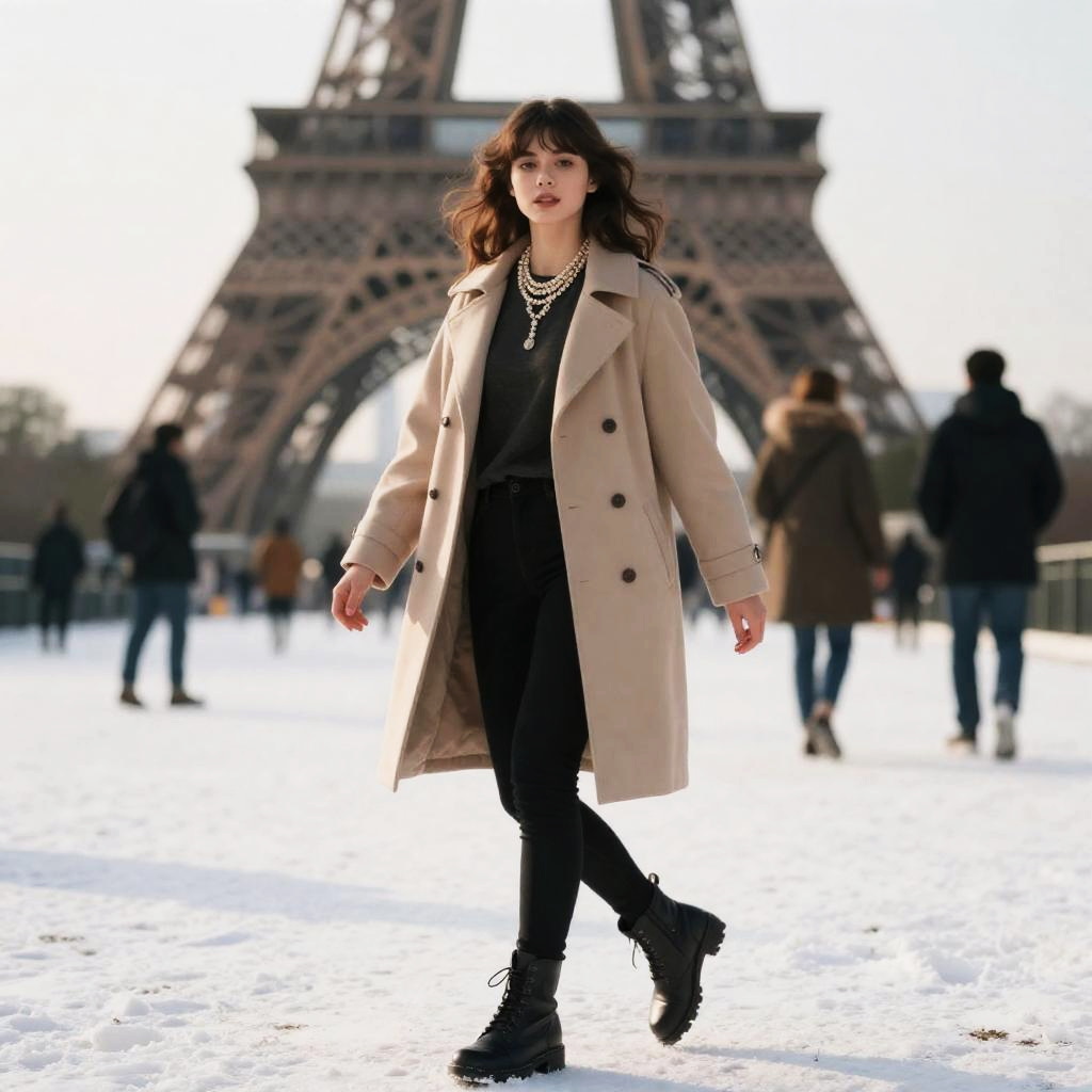 A young woman with brown hair and black eyes wearing a beige winter coat over a dark outfit poses dynamically in the snow near the Eiffel Tower in Paris. She accessorizes with layered pearl necklaces and black combat boots. In the background, blurred figures walk, highlighting a chilly winter day with warm sunlight.