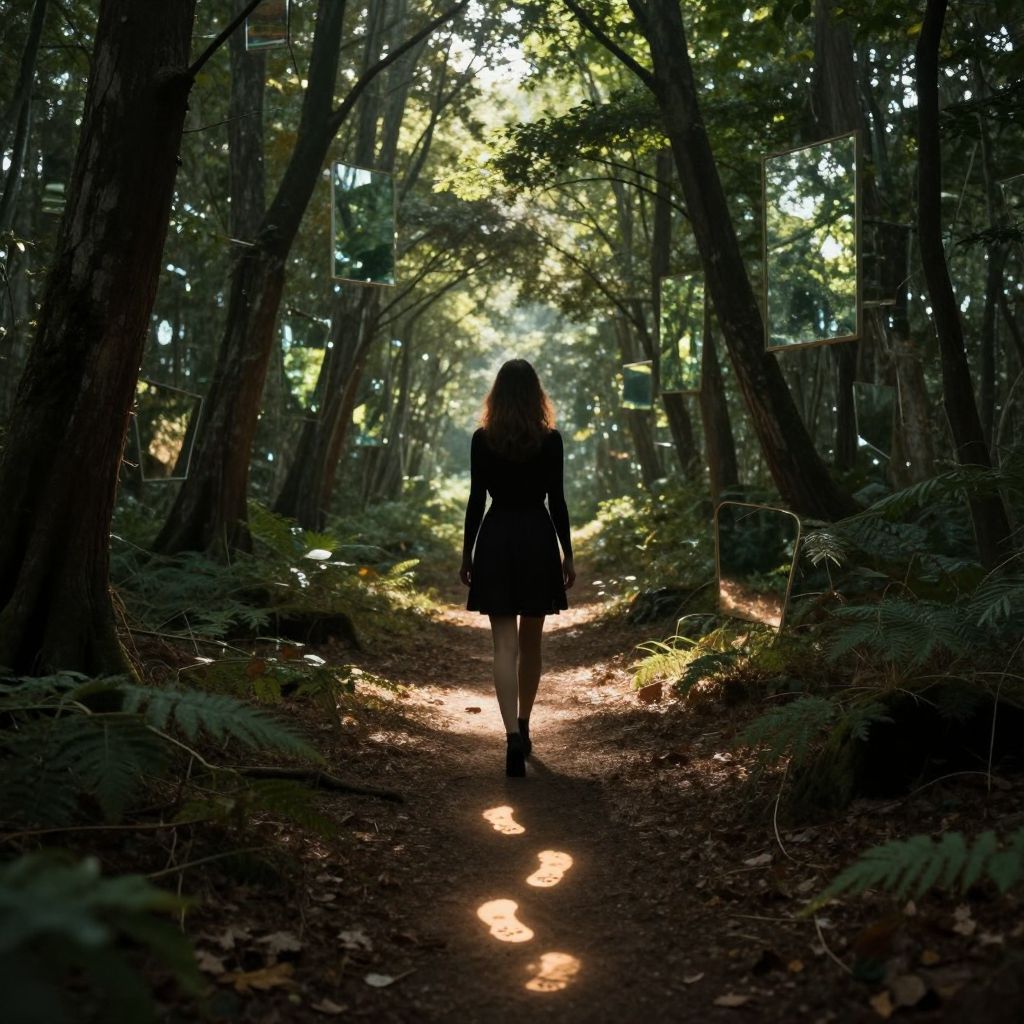 In a forest of floating mirrors, a shadowless woman walks backwards, leaving light footprints that dissolve the moment they touch the ground.