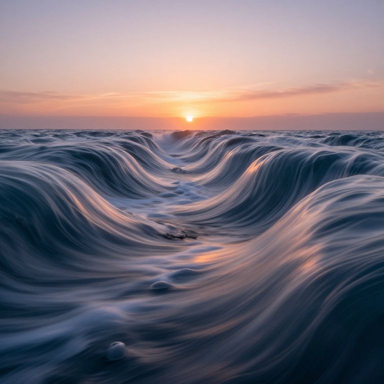 Rippling waves of liquid mountains cascade endlessly toward a horizon bathed in the soft glow of a surreal sunset, defying gravity and reality alike.