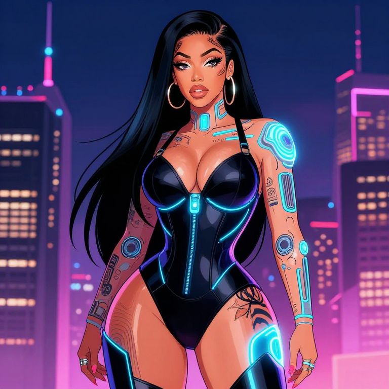 Futuristic illustration of Cardi B's body adorned with glowing cybernetic tattoos, sleek high-fashion outfit, city skyline at night, vibrant colors, digital art style