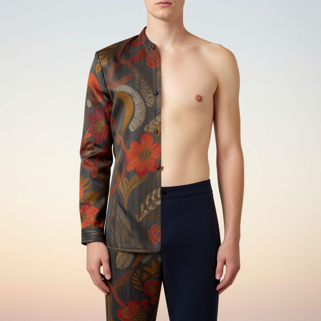 Photograph of a shirtless, fair-skinned man in a patterned, asymmetrical jacket with floral designs, black pants, against a gradient white