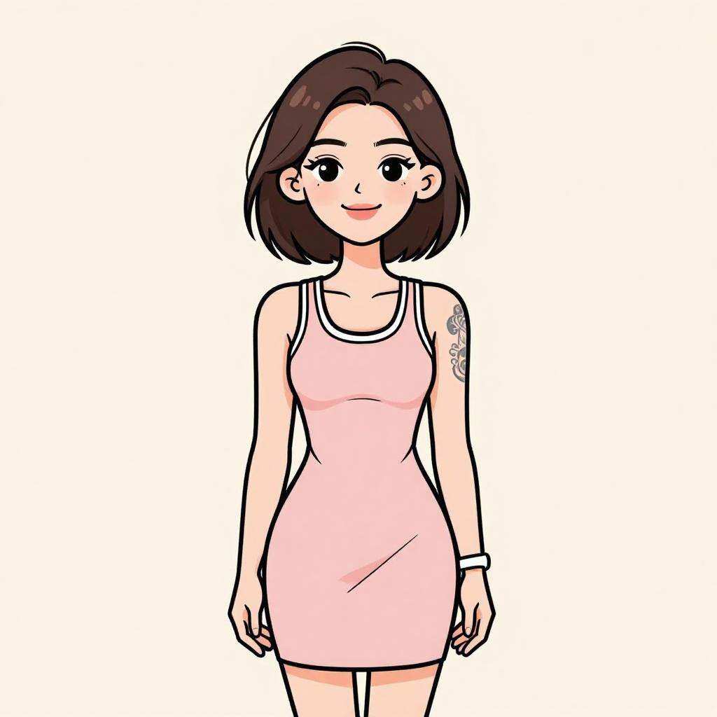 This digital drawing in a cartoon style depicts a young Asian woman with fair skin and short, dark brown hair. She has large, black eyes, a small nose, and a gentle smile. She wears a sleeveless, light pink dress that fits snugly, highlighting her slender figure. On her left upper arm, she has a detailed black tattoo. The background is plain white, emphasizing the character. The lines are bold and the colors are solid, typical of a clean, modern digital illustration. Her relaxed stance and simple expression convey a calm, approachable demeanor.