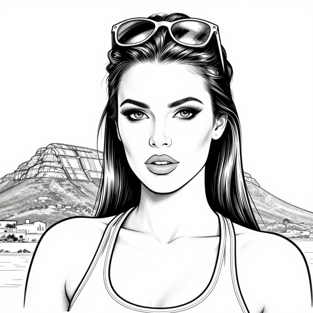 Black-and-white digital drawing of a confident woman with long dark hair, sunglasses on head, wearing a tank top, mountains in background.