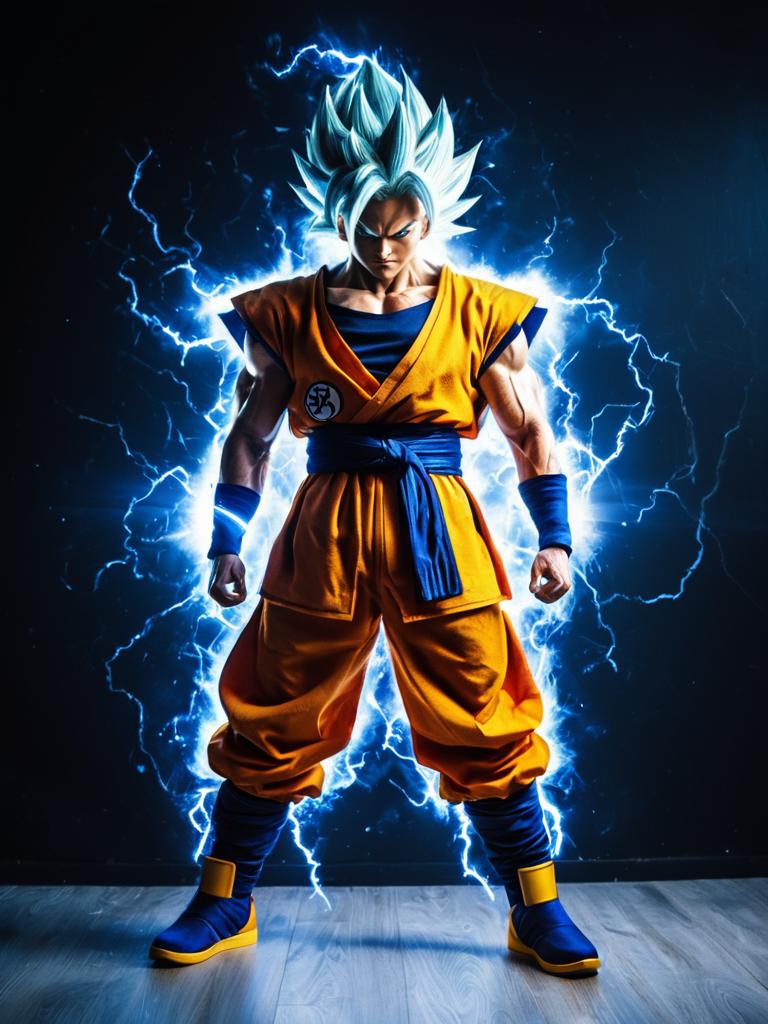Man in Super Saiyan Costume, full-body cosplay photo with glowing aura effect