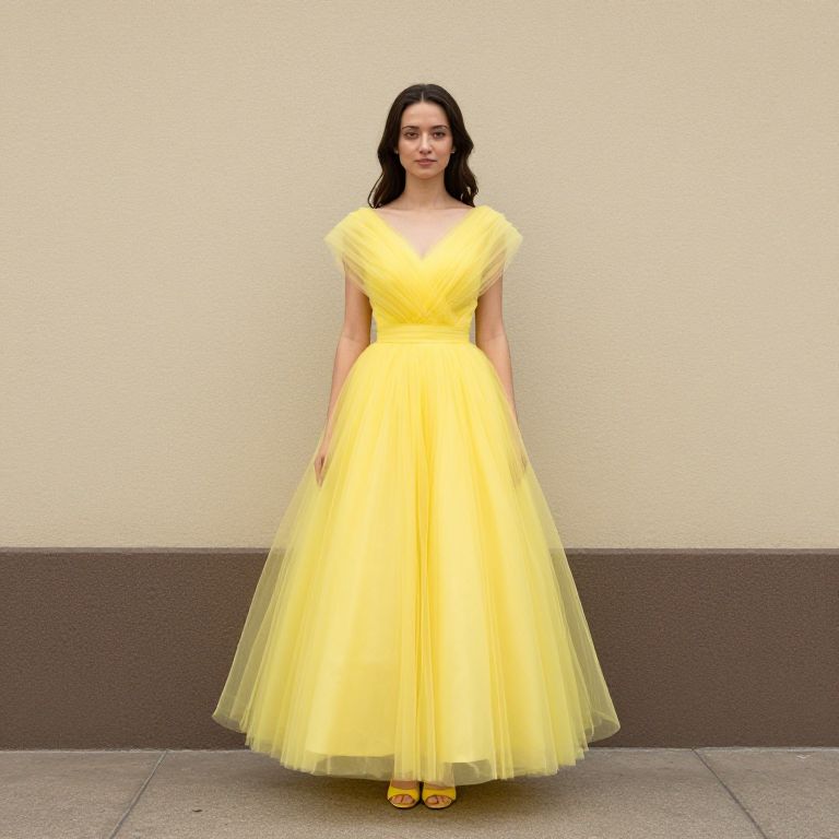 "Yellow Fairy Dress, fairy in yellow dress standing in front of a wall"
