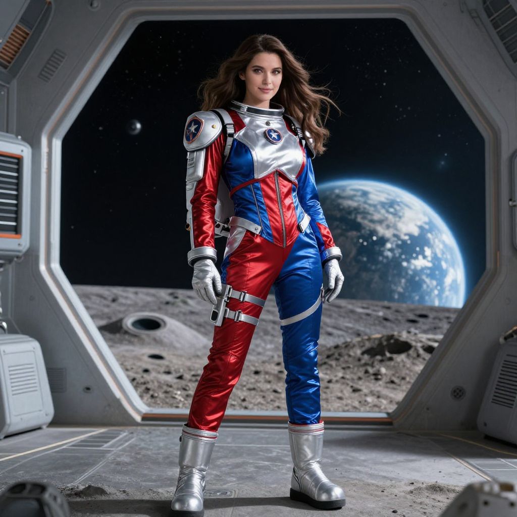 A photorealistic image of a glamorous astronaut fancy dress woman with long brown hair flowing gently, wearing a custom-designed astronaut costume featuring red and blue metallic fabrics, large astronaut boots, a shoulder-mounted badge with a star, standing inside a large futuristic space station on a moon-like surface with craters and distant glowing Earth in the background, wearing a subtle, professional expression.. The woman has big breasts and cute face