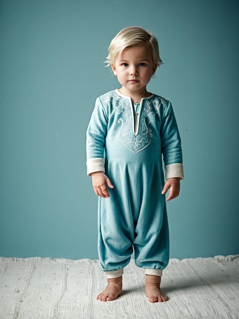 Newborn elsa costume, solo, male focus, 1boy, barefoot, full body, standing, looking at viewer, child, realistic