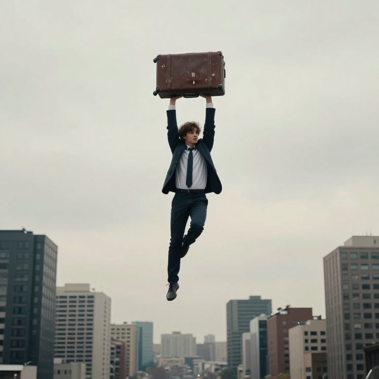Suspended above the ceaseless hum of the city, a solitary figure clings to a suitcase, embodying the paradox of freedom and confinement, as the weight of purpose and the pull of gravity converge in a fleeting moment of existential contemplation.