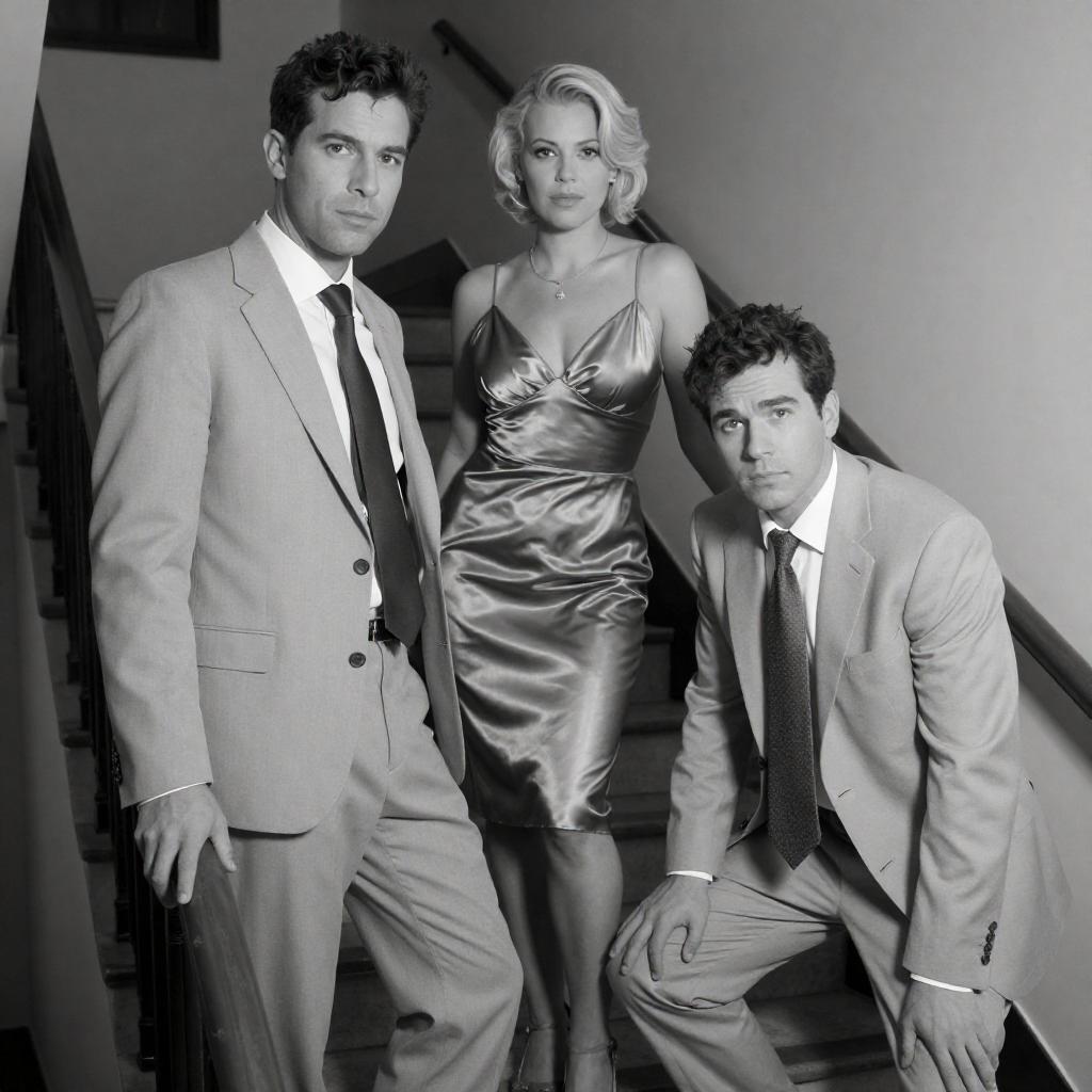 Black and white photograph of three people on a staircase. A man in a light suit and tie stands to the left, a blonde woman in a satin dress with a necklace stands in the center, and another man in a light suit and tie kneels to the right. All have intense expressions. The man on the left holds the staircase railing, while the woman leans slightly forward. The man on the right looks directly at the camera. The lighting creates strong shadows.
