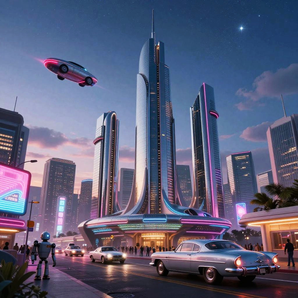 Atompunk City Skyline with Neon and Hovercars