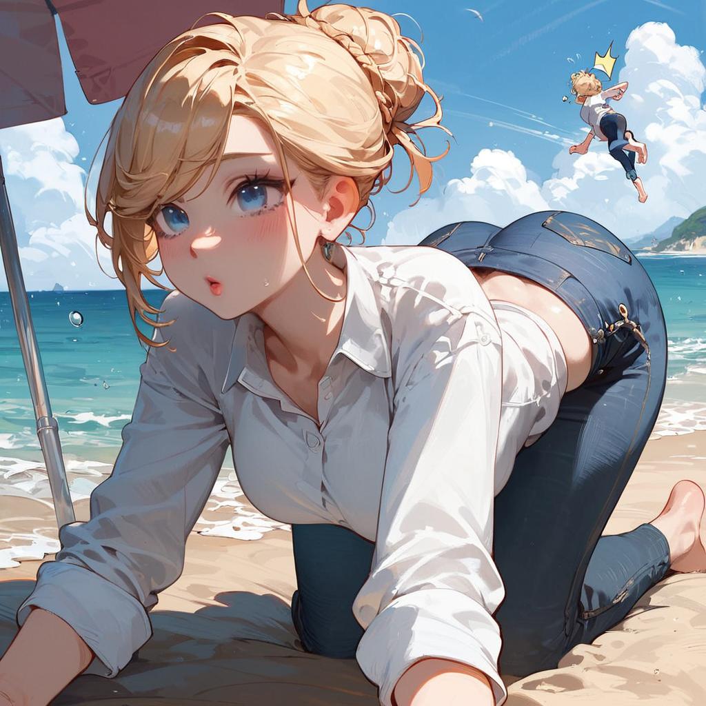 Score_9, score_8_up, score_7_up, score_6_up, score_5_up, score_4_up, source_anime, 1girl, green eyes, blonde hair, hair bun, surprised, m-on-fours, round ass, jeans pants, white shirt, on beach, ocean background, best quality, best res, 4K UHD