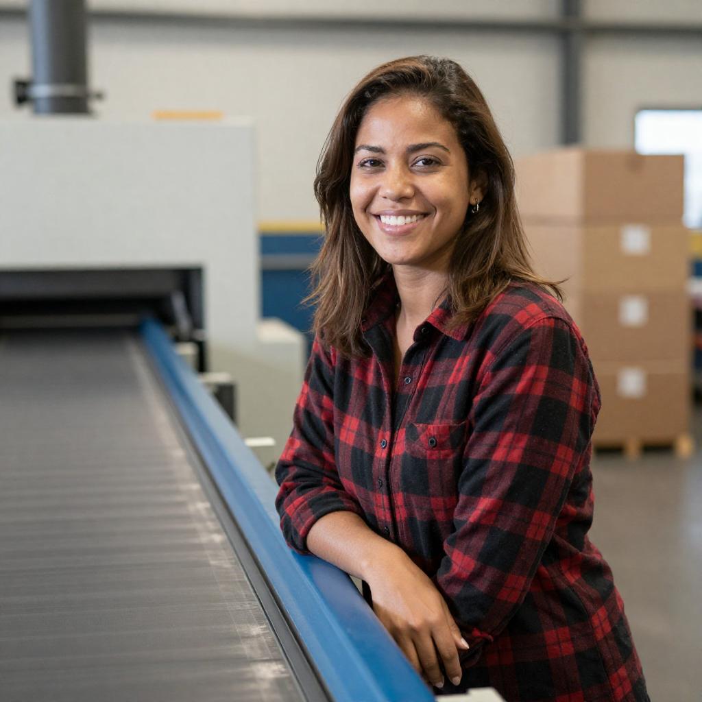 Photograph of a smiling woman with light brown skin and shoulder-length brown hair, wearing a black and red plaid shirt, standing in a brightly lit industrial setting. She leans on a blue conveyor belt, with metal machinery and stacked boxes in the background. Her casual attire contrasts with the industrial environment.