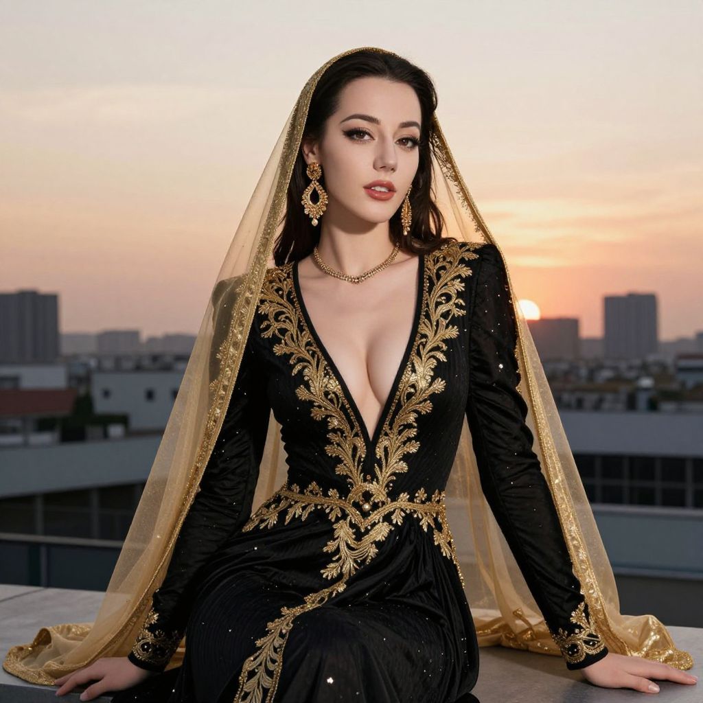 Photograph of a beautiful woman with fair skin and dark hair, wearing a black, deep-V-neck, long-sleeved gown with gold embroidery and a sheer gold veil. She sits on a rooftop with a cityscape and a sunset sky in the background. She has large gold earrings and a necklace, and her makeup is bold with dark eyeliner and red lipstick. The sunlight highlights her elegant, poised look.