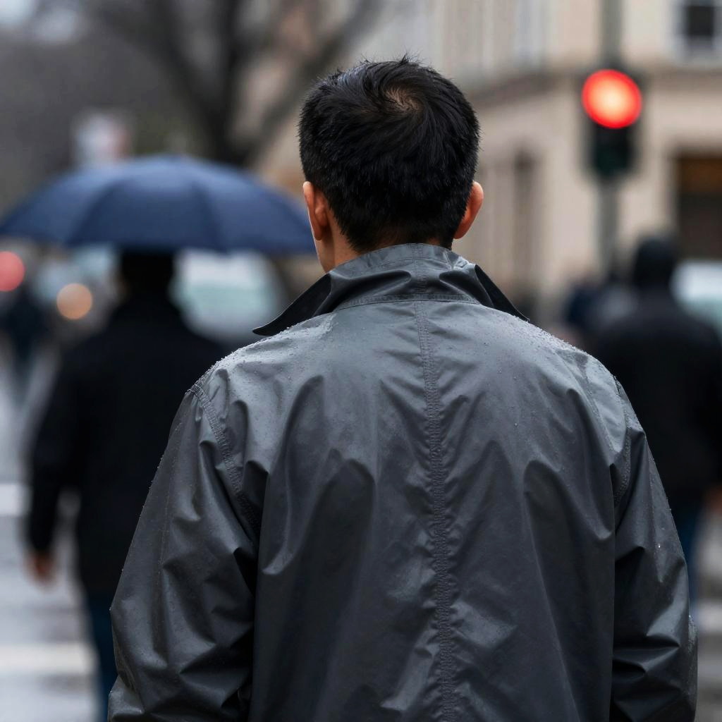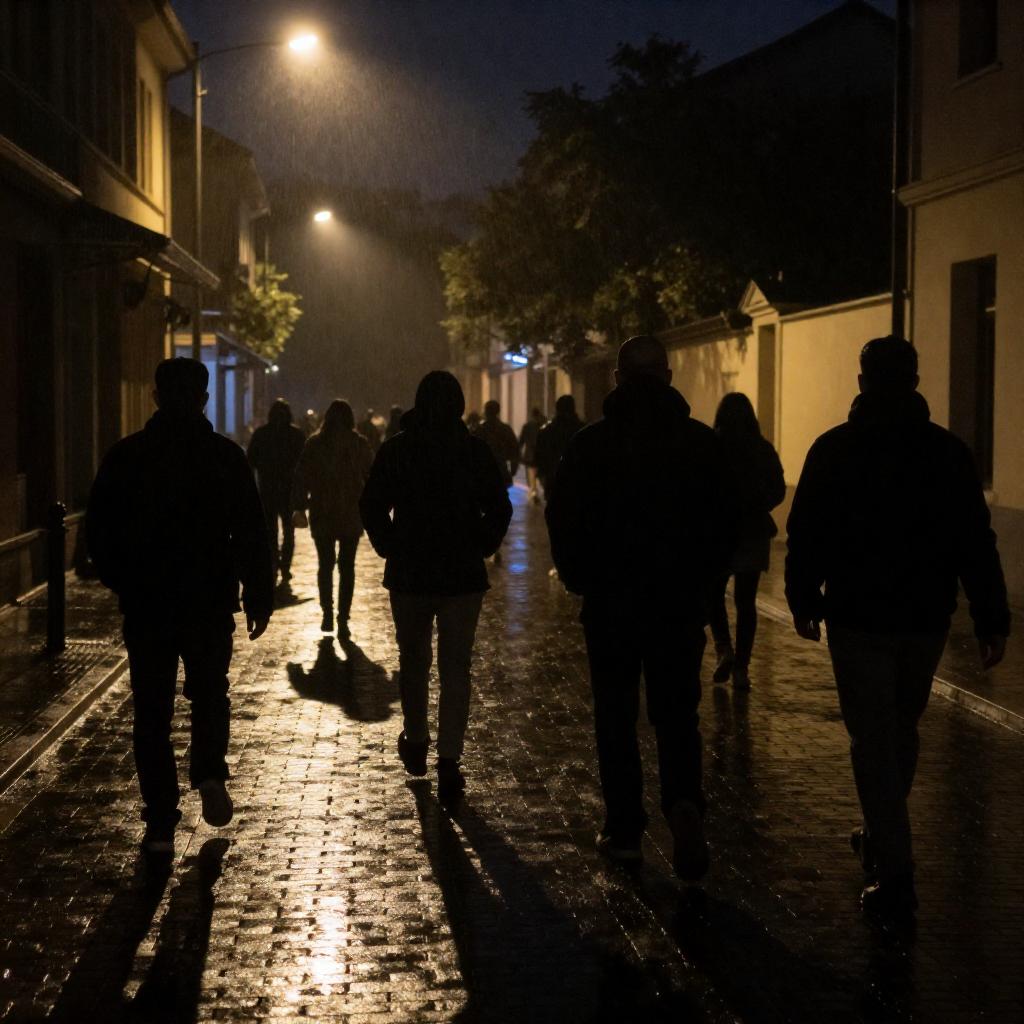 Nighttime photograph of a dark, cobblestone street with numerous silhouetted people walking away from the camera. Streetlights cast a yellow glow, creating long shadows. Rain falling, making the street wet. People in various clothing styles, indistinguishable features. Background includes buildings and trees, partially visible.