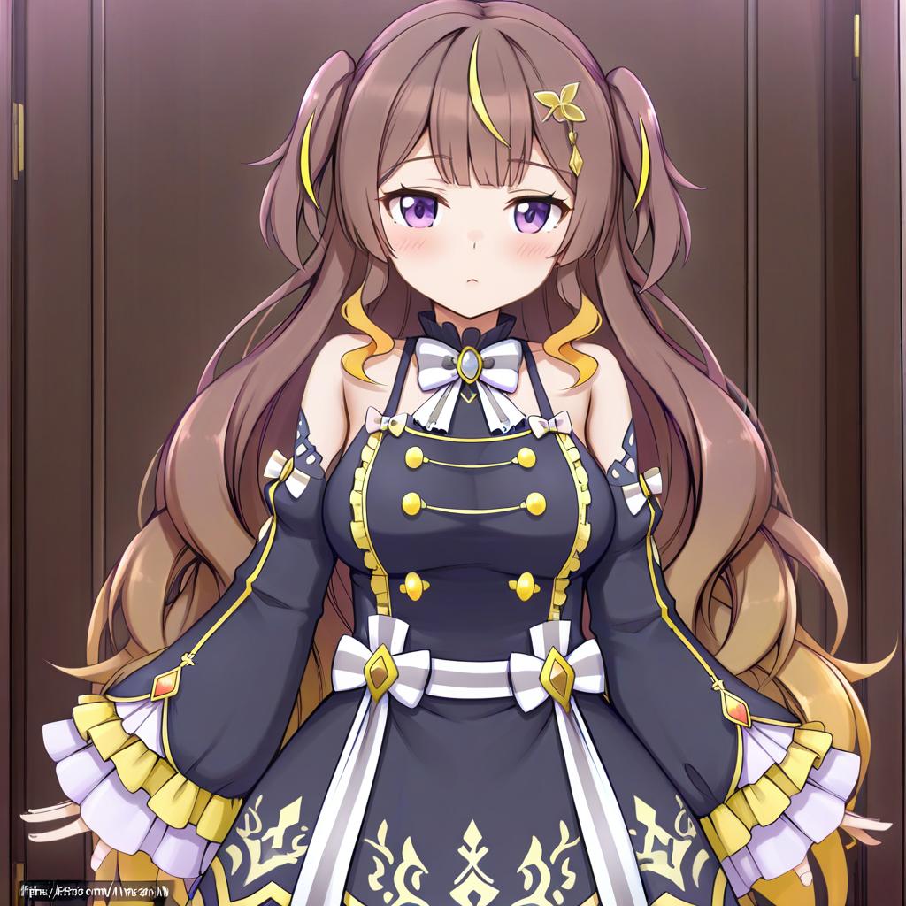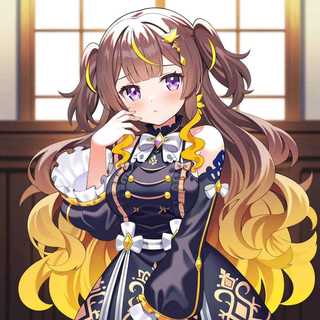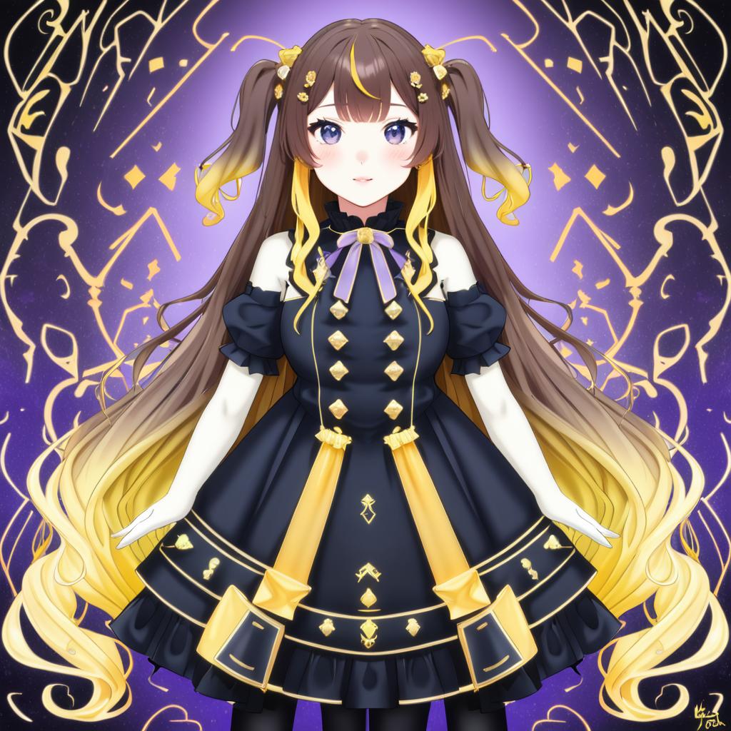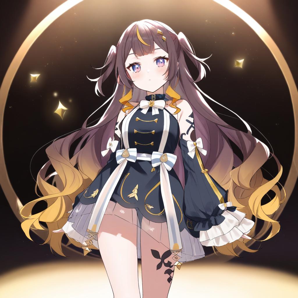 Anya melfissa (1st costume), hololive, 1girl, purple eyes, brown hair, blonde hair, gradient hair, streaked hair, very long hair, long hair, wavy hair, two side up, hair ornament, medium breasts, black dress, detached sleeves, virtual youtuber, virtual youtuber, by artist saigado, illustrious