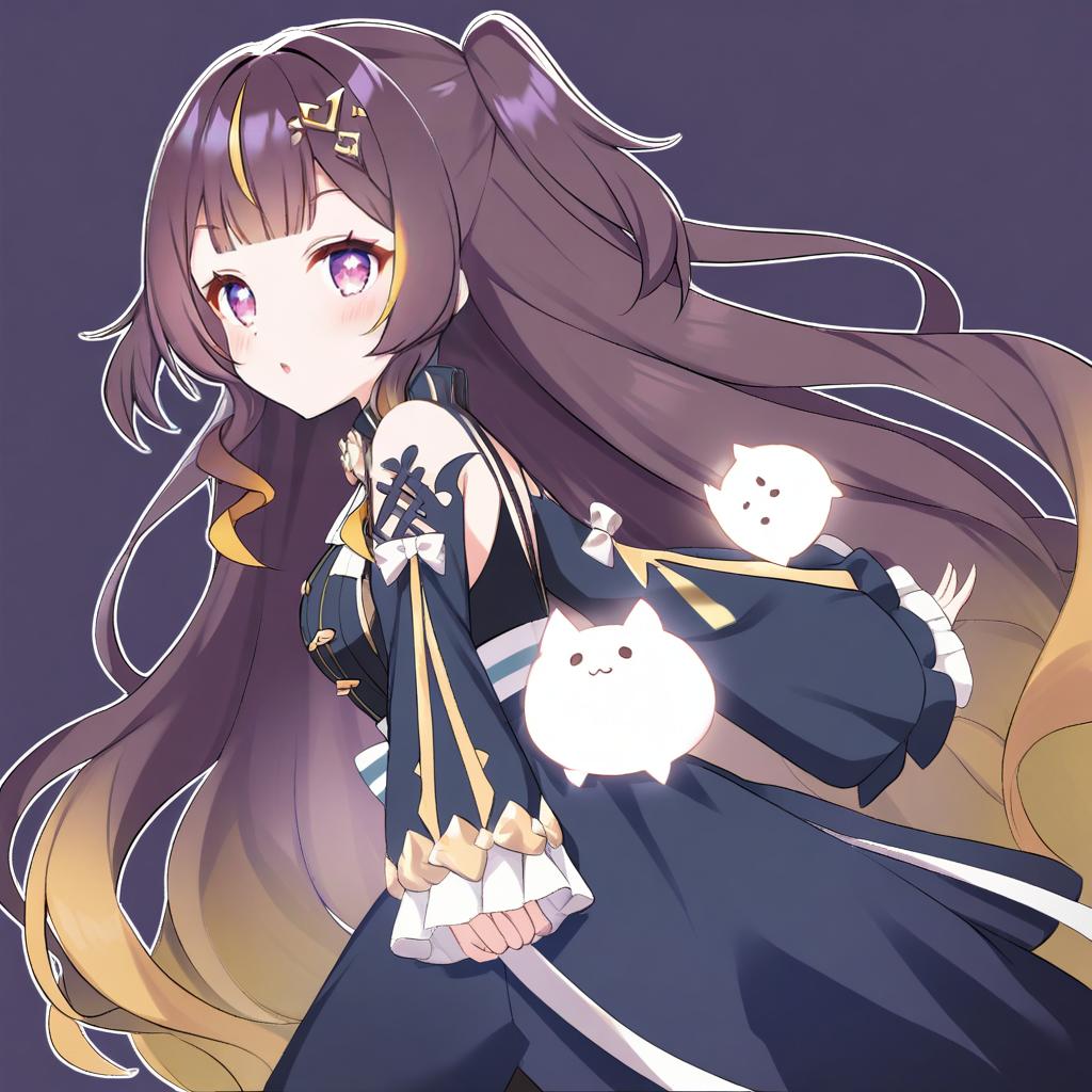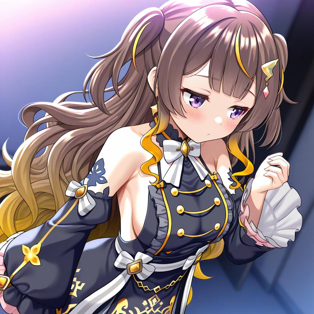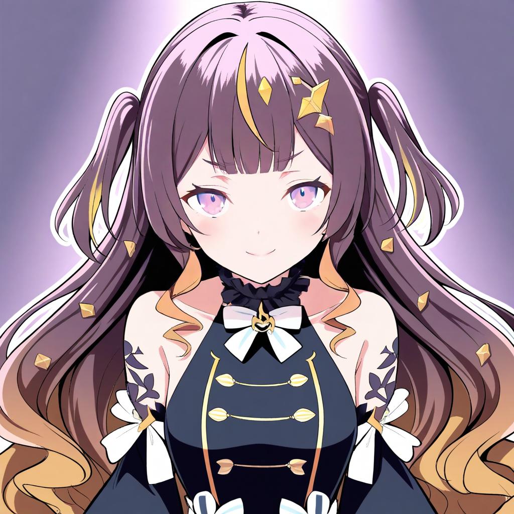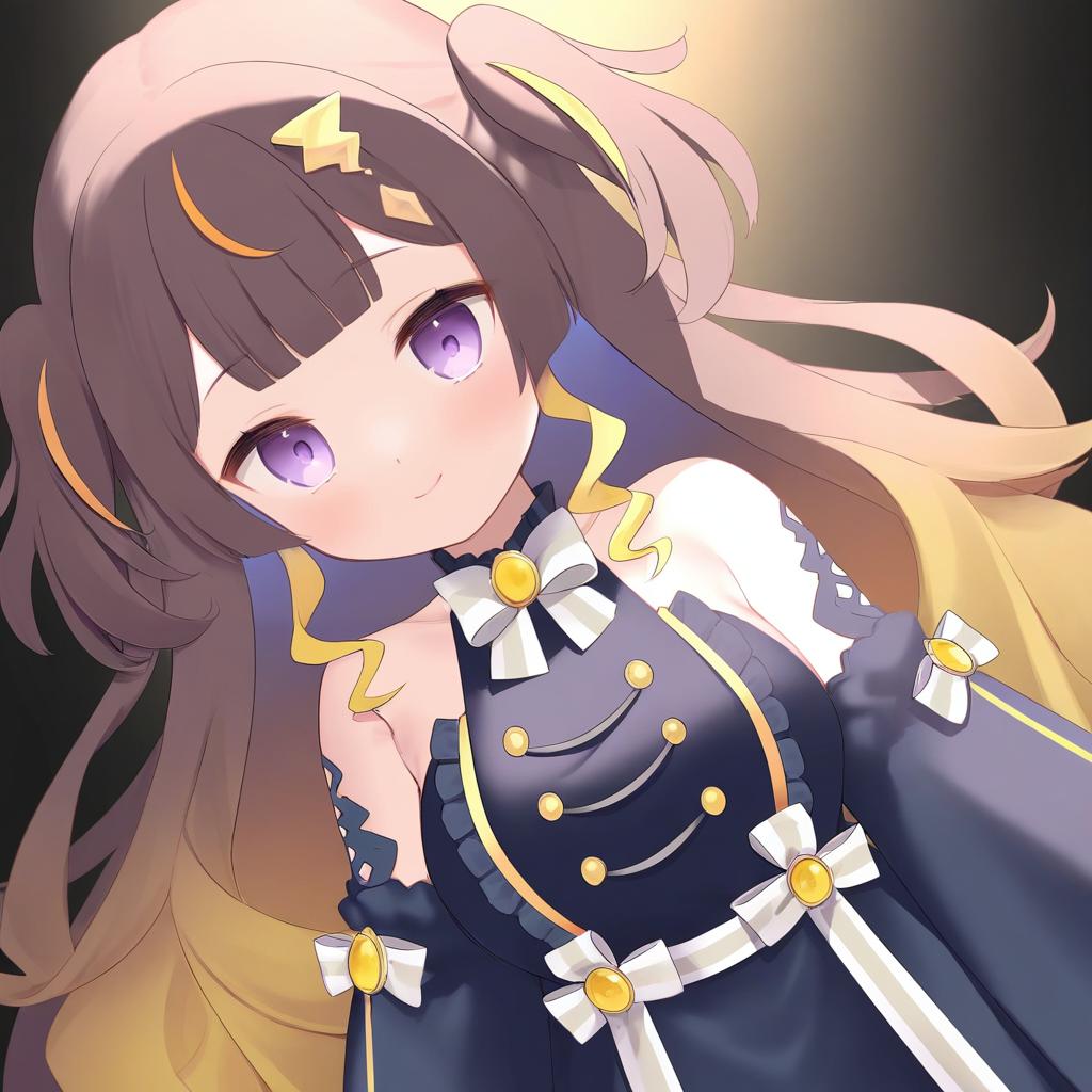 Anya melfissa (1st costume), hololive, 1girl, purple eyes, brown hair, blonde hair, gradient hair, streaked hair, very long hair, long hair, wavy hair, two side up, hair ornament, medium breasts, black dress, detached sleeves, virtual youtuber, virtual youtuber, by artist saigado, illustrious