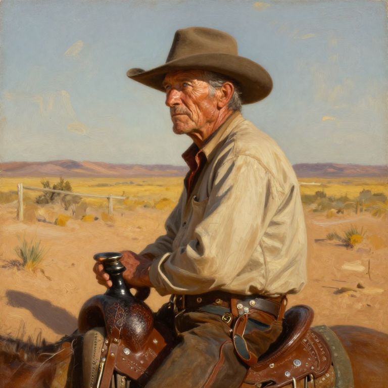 Create an image of a hyperrealistic oil painting that captures the portrait of an old-fashioned cowboy. He has sun-creased skin and calm, blue eyes that gaze into the distance, shielded by the shadow of his wide-brimmed hat. The unique perspective showcases his profile, highlighting the intricate details of his well-worn leather boots and the beautifully tooled saddle he sits upon. Warm, golden light illuminates the scene, casting long shadows across the dusty desert landscape. The emotional focus transitions from the rugged resilience in the cowboy's expression to the vast, unforgiving wilderness that stretches beyond, evoking a deep sense of solitude and contemplation. This timeless, hyperrealistic portrait captures a moment of quiet strength and reflection in a harsh yet captivating environment.