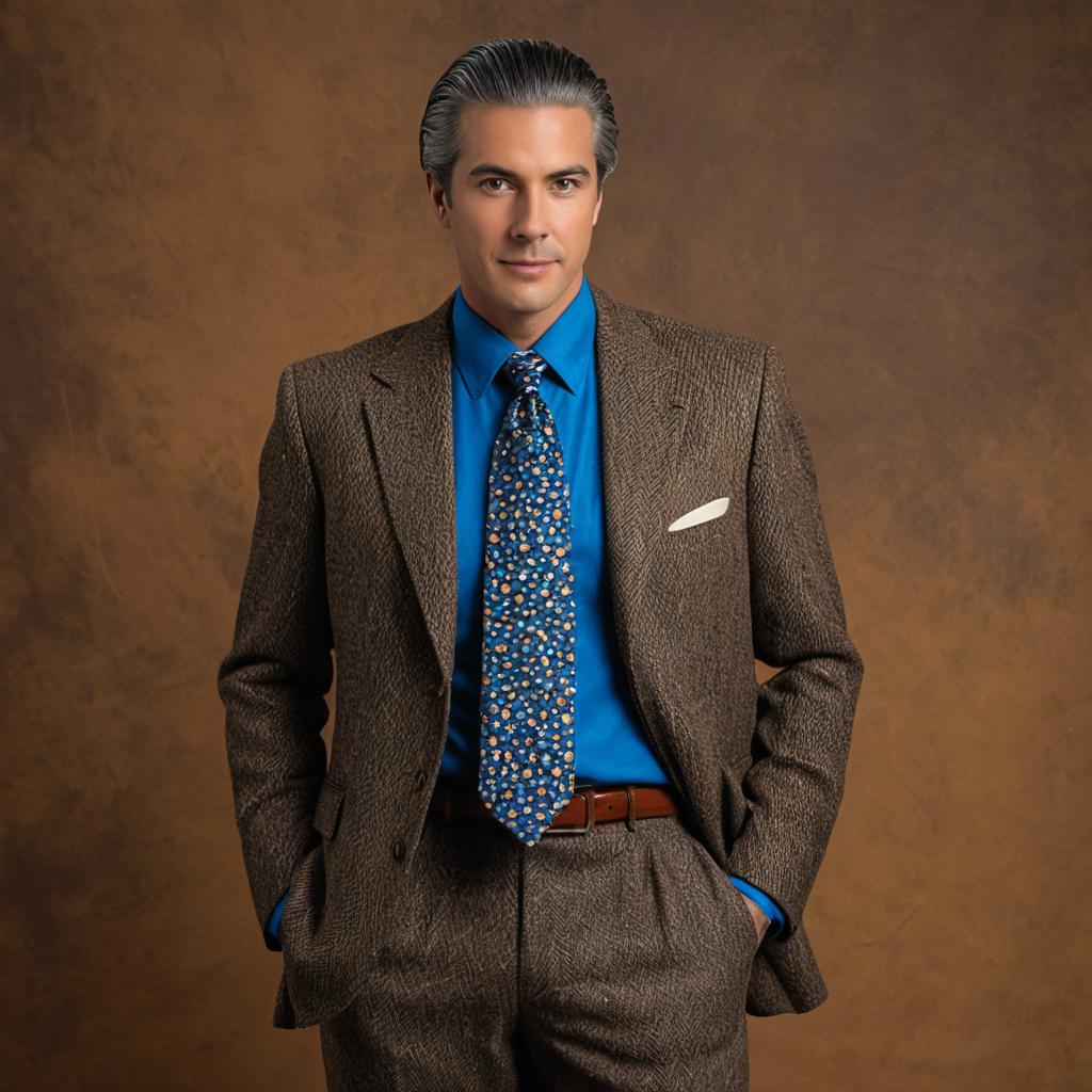 Man in Vintage Brown Tweed Suit with Blue Shirt and Patterned Tie