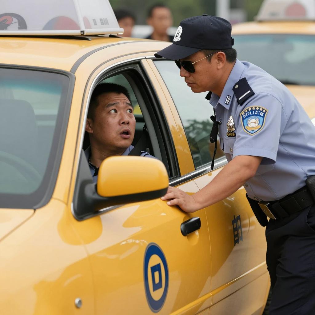 A police officer leaning into a yellow taxi. Officer wears dark sunglasses, black cap, gray shirt with black bow tie. Driver, inside taxi, looks up with surprised expression. Yellow taxi dominates left side, officer on right. Background is blurred. Officer's right hand rests on taxi window. Two people.