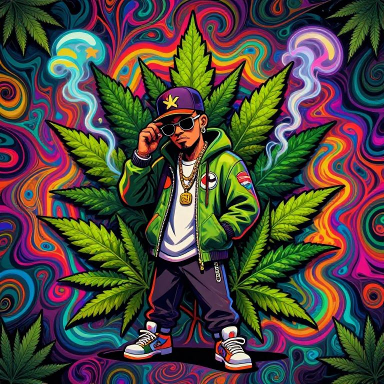 Trippy gangster weed wallpaper portraying a stylized hip-hop character surrounded by swirling psychedelic weed leaves and colorful smoke trails. The background layers vivid fractal patterns with bold street art aesthetics, combining surrealism and urban culture in one image.