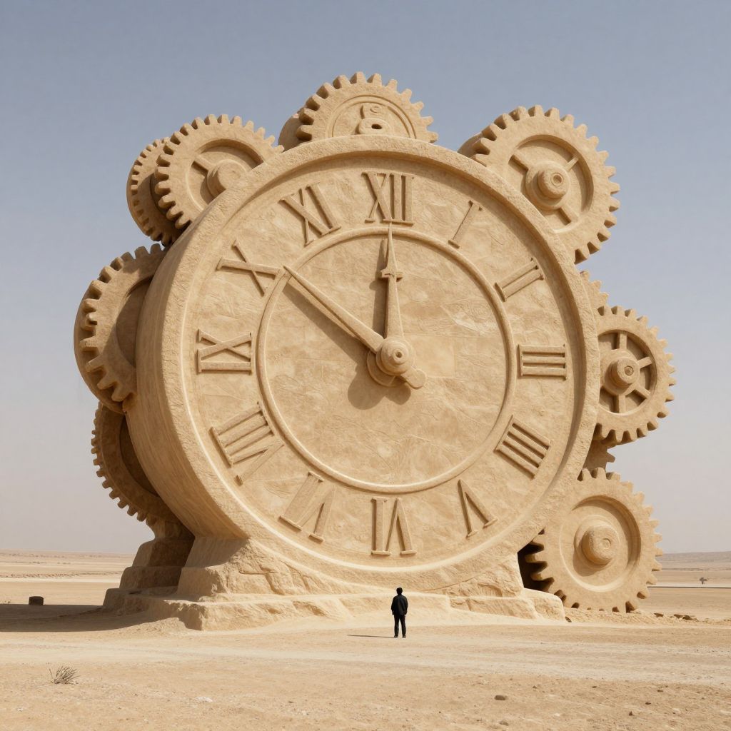 A colossal, sandstone clock with cascading, melting gears looms over a desolate desert, its Roman numerals etched into eternity while a lone figure stands dwarfed by its surreal, gravity-defying presence.