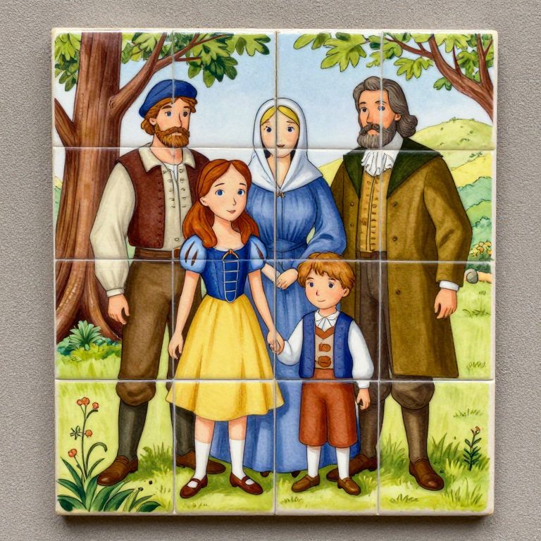 Tile a family portrait of hansel, gretel, their stepmother and their father in the style of a story book,