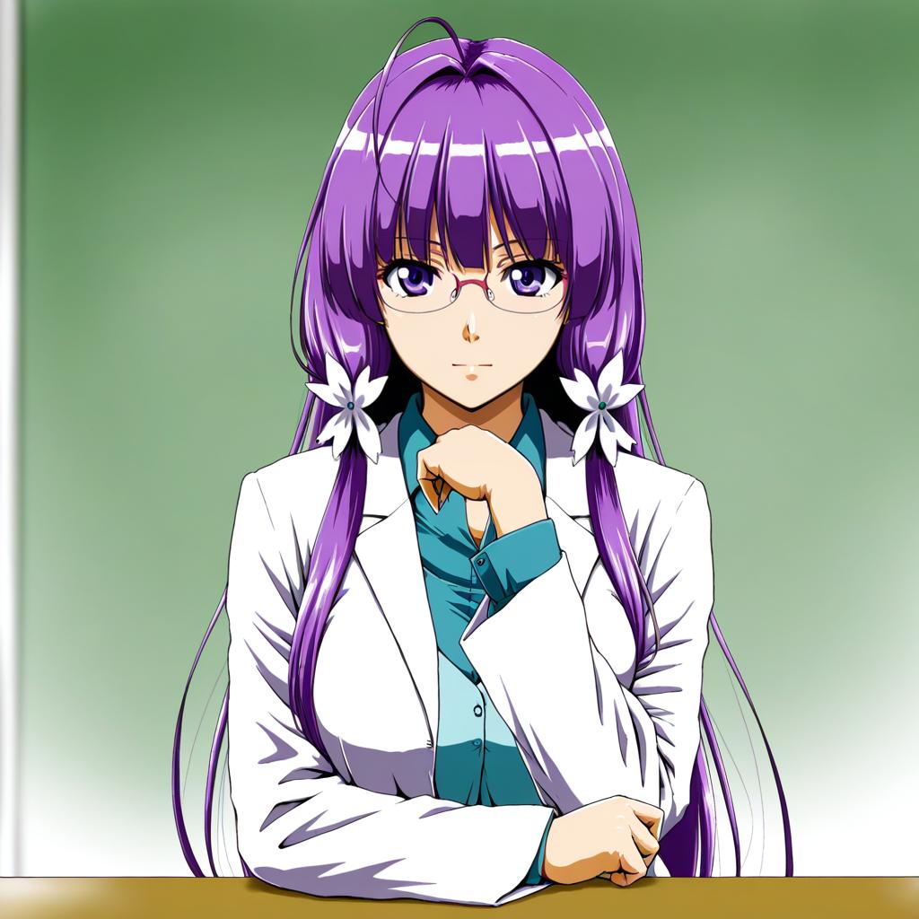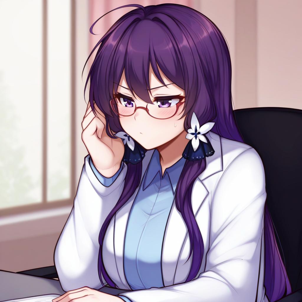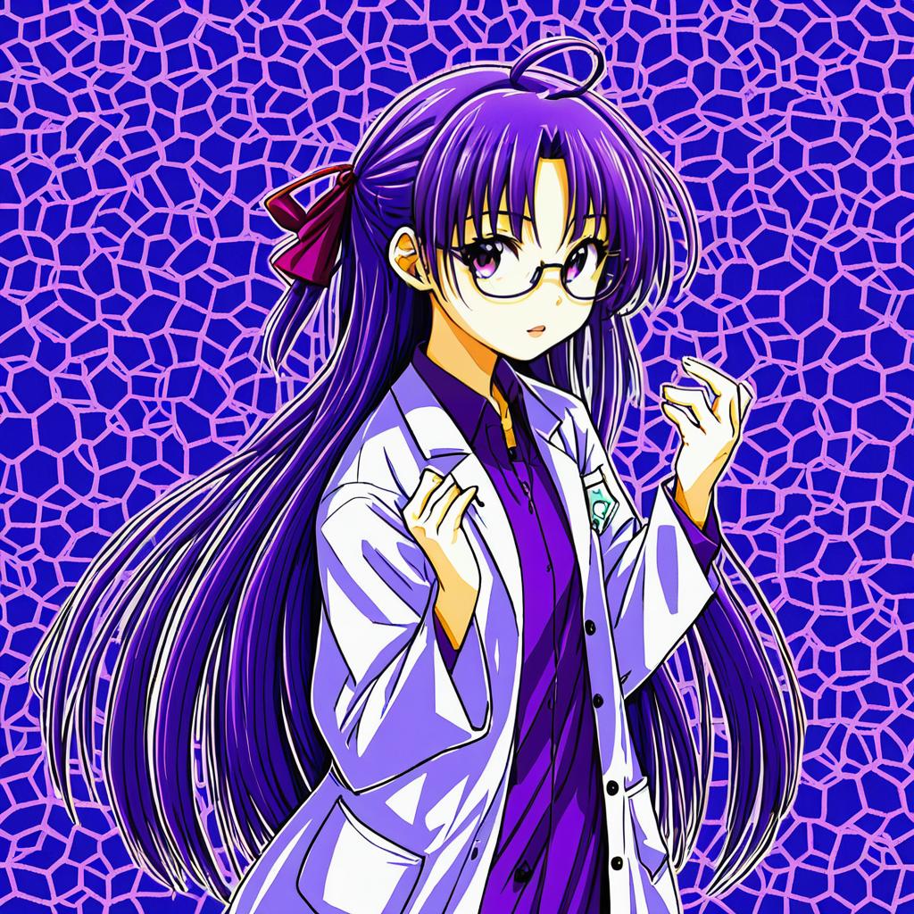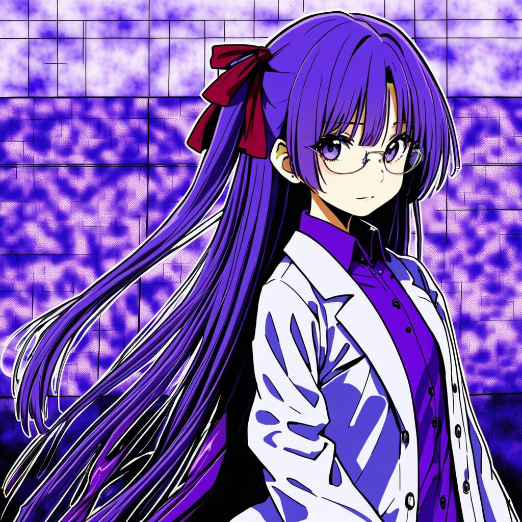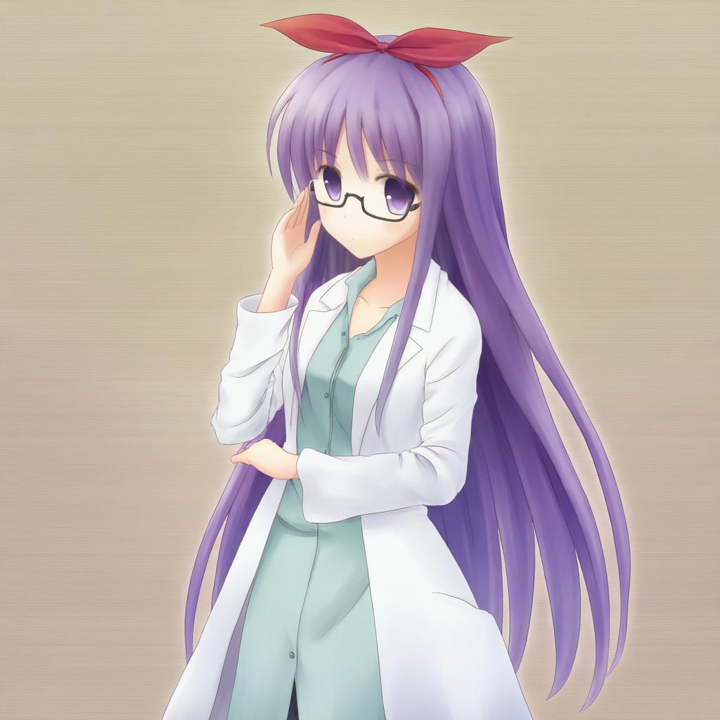 Asakura rikako, touhou, 1girl, purple eyes, glasses, purple hair, long hair, very long hair, hair ribbon, lab coat, long sleeves, by artist hakusai (tiahszld), leet