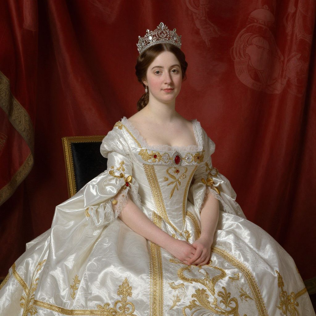 Photograph of a fair-skinned woman with brown hair in an elegant updo, wearing a white, full-skirted gown adorned with gold floral embroidery and a blue gemstone at the center. She has a silver tiara with intricate designs on her head. She sits on a gold-framed chair against a rich red velvet backdrop. Her expression is calm and poised, with a slight smile. The texture of the gown is satin-like, and the embroidery adds a regal touch to the overall appearance. The lighting is soft, highlighting her gentle features and the luxurious fabric of her dress.
