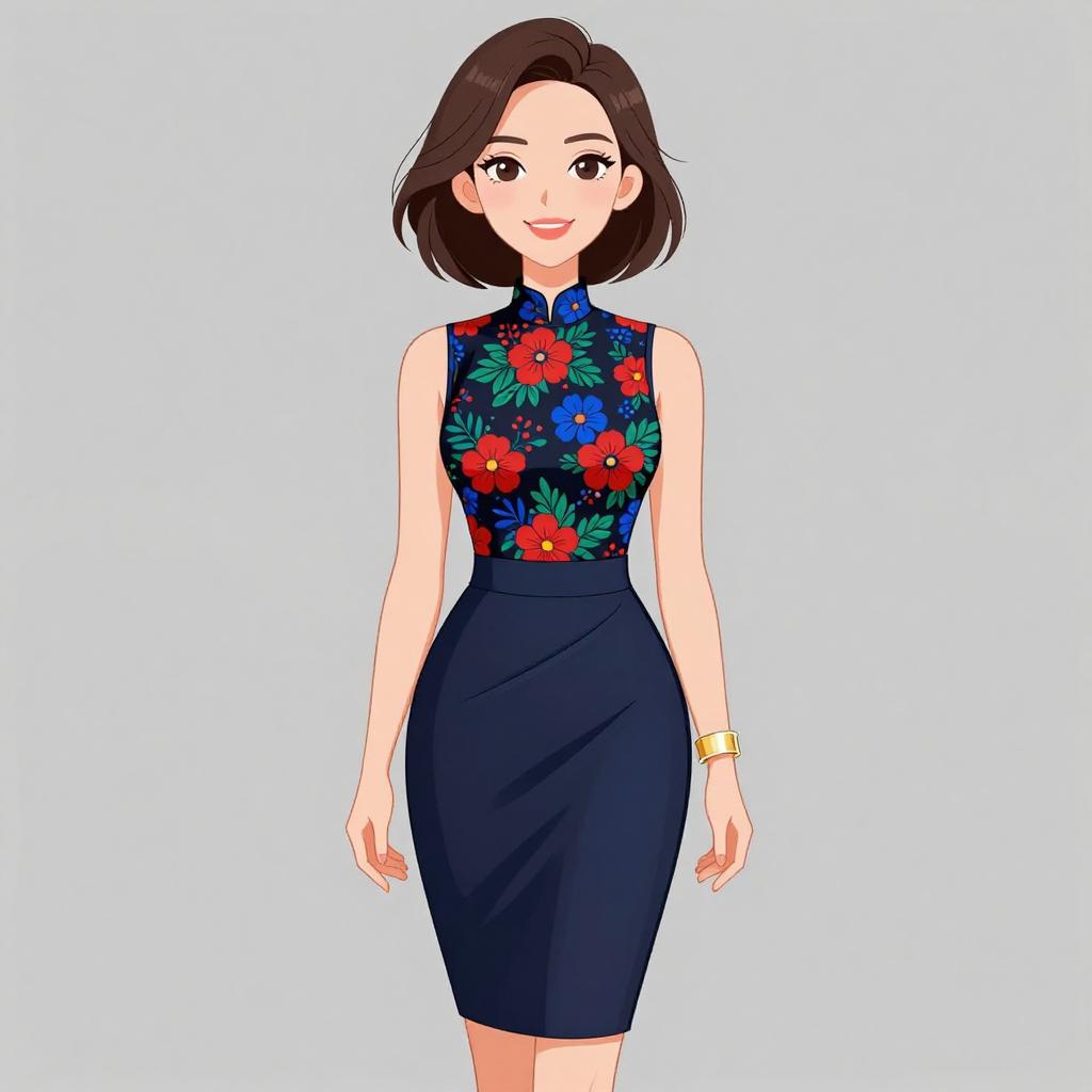 Woman with pretty face and pretty hair. smiling Woman, trendy fashion, high neck top with sleeveless design, floral pattern with red and blue flowers on black background, fitted knee-length skirt in solid navy blue, asymmetrical wrap style, gold cuff bracelet on one wrist. --sref 1467
