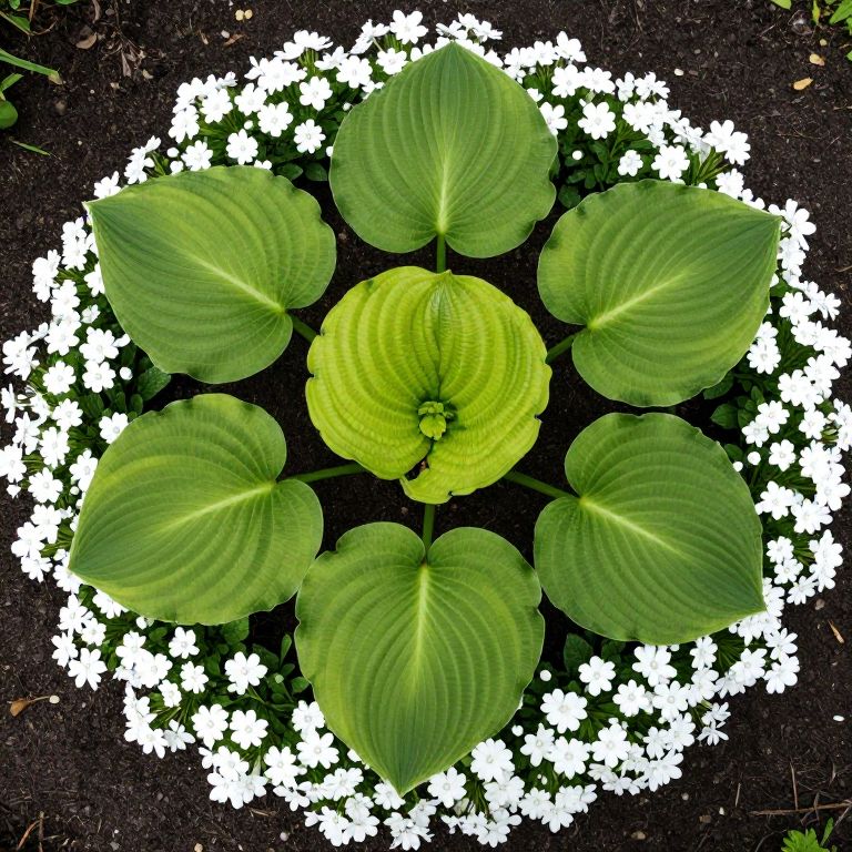 Vibrant garden showcases a symmetrical arrangement of six spherical hosta plants surrounded by clusters of delicate white flowers, creating a striking contrast against the dark soil backdrop.