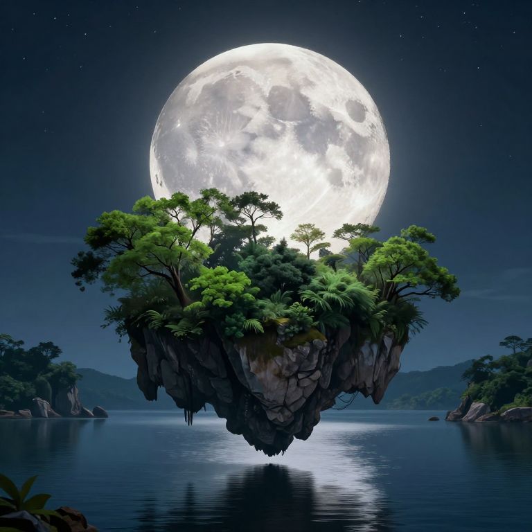 Digital art of a floating island with lush green trees under a glowing full moon, reflected in a calm, starry night sea.
