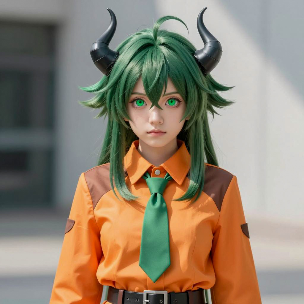 Photo-realistic cosplay portrait of a person dressed as an anime character inspired by My Hero Academia. The subject has vibrant green hair styled with black horns, green eyes, and wears an orange and brown long-sleeve shirt paired with a green necktie and a black belt with a silver buckle. The image is a close-up with detailed hair and eyes, showcasing realistic shadows and highlights, set against a blurred gray and white background under soft sunlight.