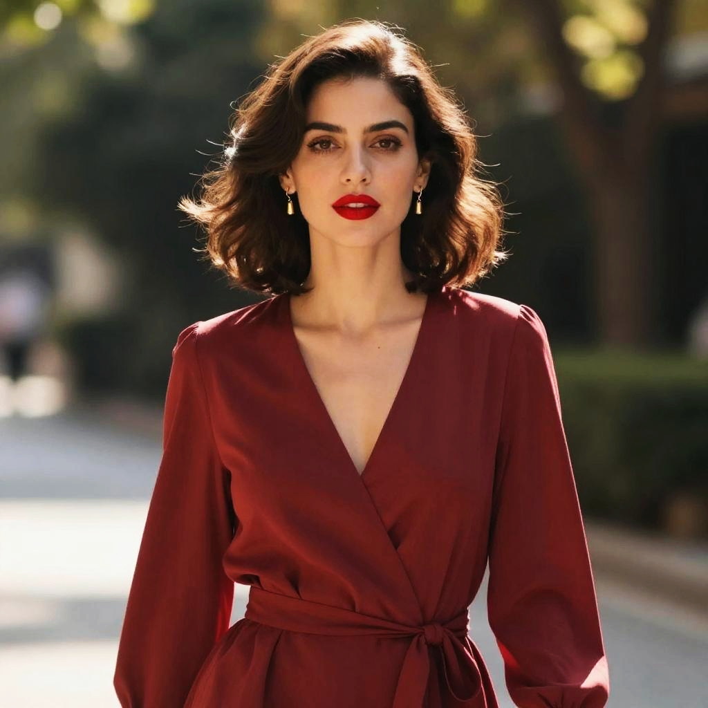 A photorealistic portrait of a woman dressed in a stylish Carmen Sandiego costume, featuring her signature red hat and coat paired with a blue shirt and black gloves. The image captures a mysterious and sophisticated vibe, set against a softly blurred urban background.