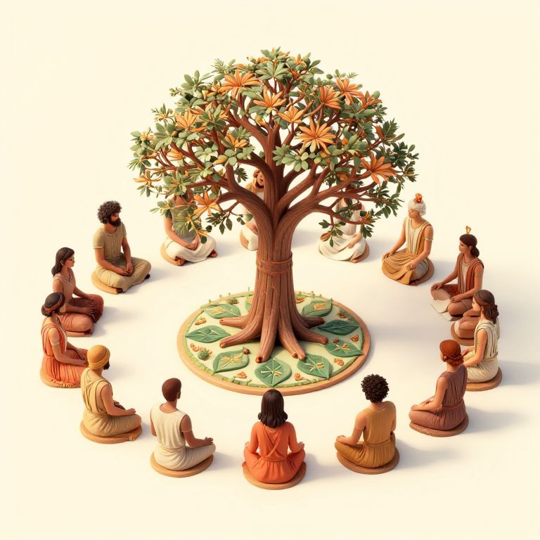 Greek Art dreamcore sacred ceremony scene of 12 people meditating in a circle around the tree of life, axonometric,