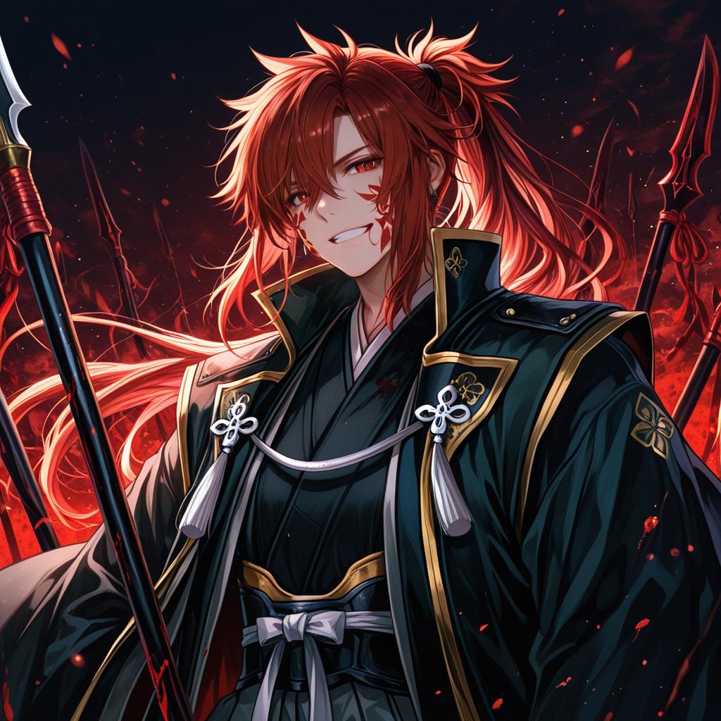 Mori nagayoshi (fate), fate (series), 1boy, sharp teeth, yellow eyes, hair over one eye, red hair, long hair, spiked hair, ponytail, blood on face, japanese clothes, japanese clothes, spear, jinbaori, by artist kazu (muchuukai), dark_illustrious