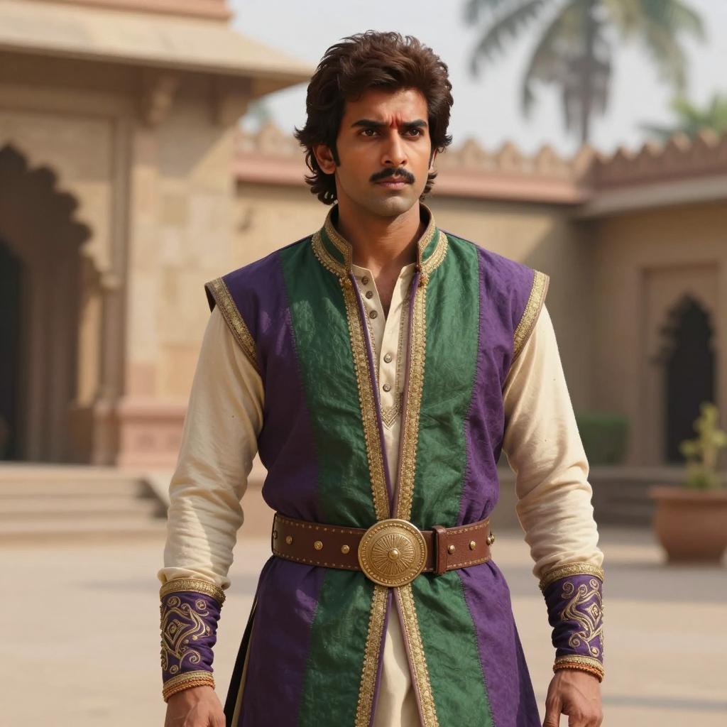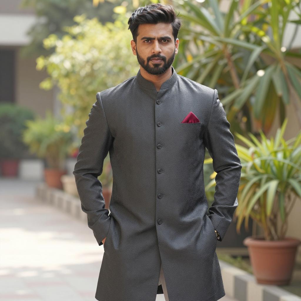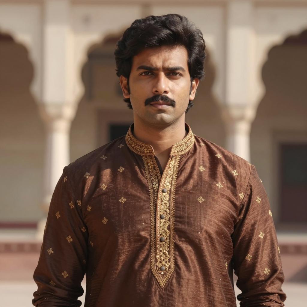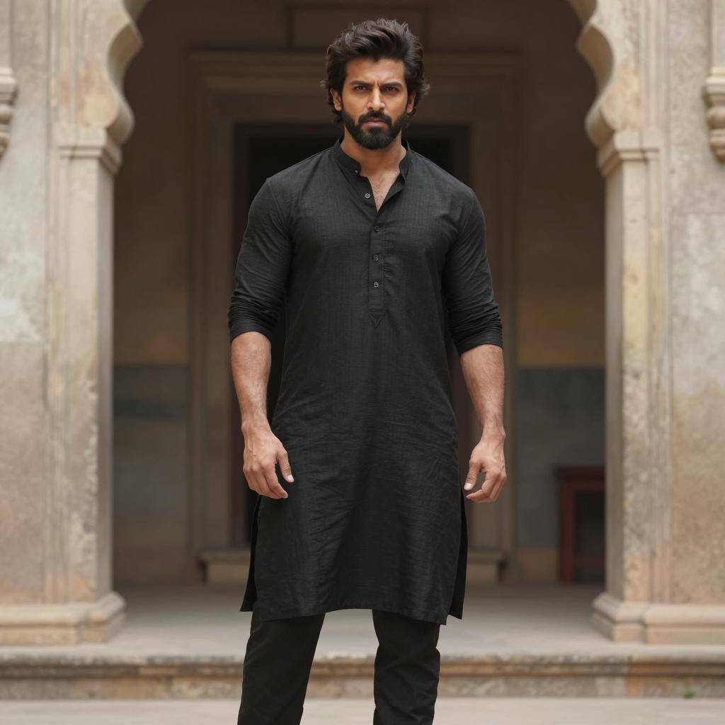 Bollywood film dress costume, photograph of a handsome Indian man with dark hair and beard, wearing a black traditional long kurta, standing in front of a stone archway, daytime, serious expression, slightly muscular build, medium skin tone, natural light, realistic style, subtle shadows, background shows old architectural details, full body shot, front view, casual attire, minimal accessories, medium shot