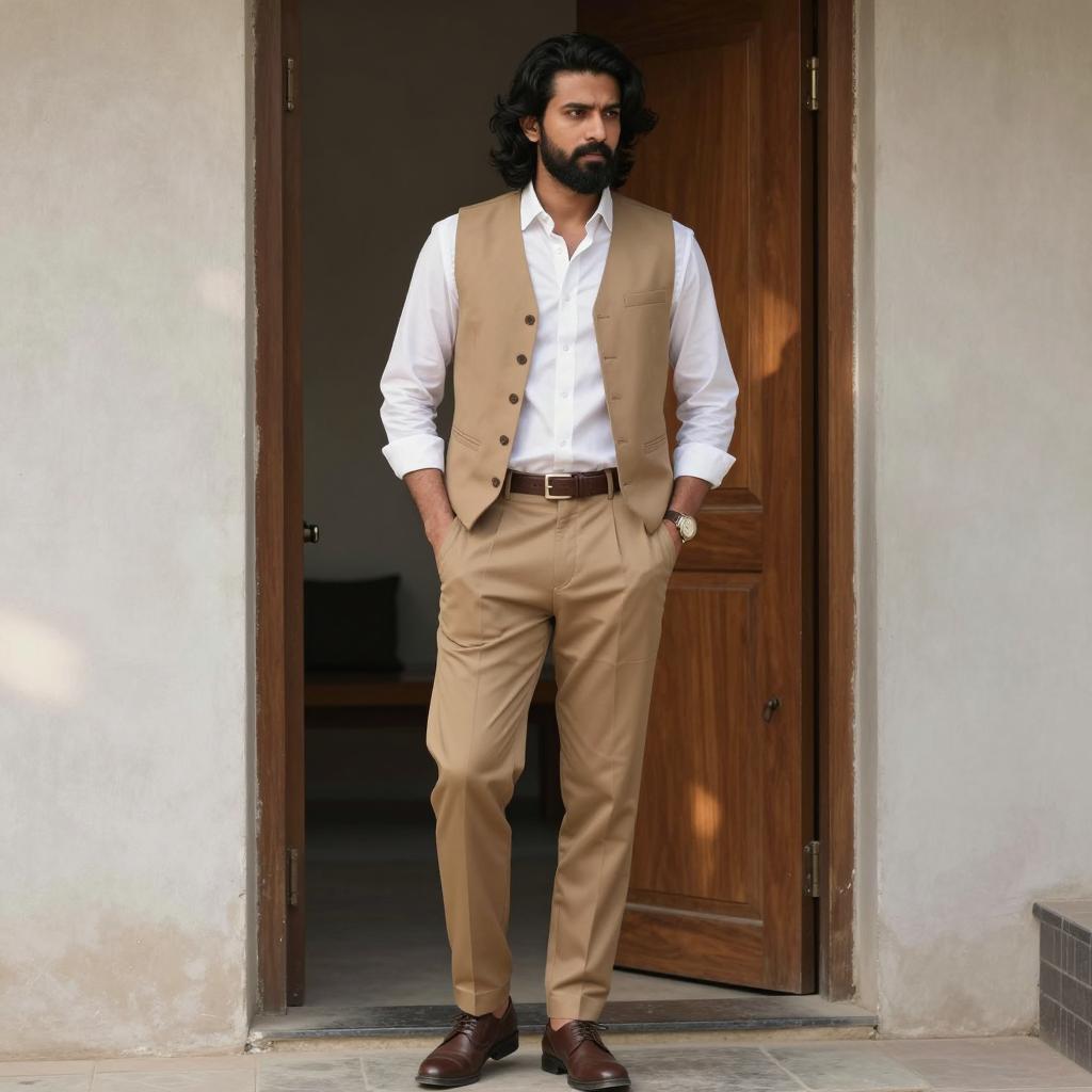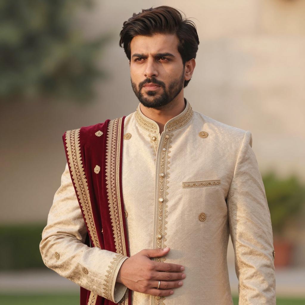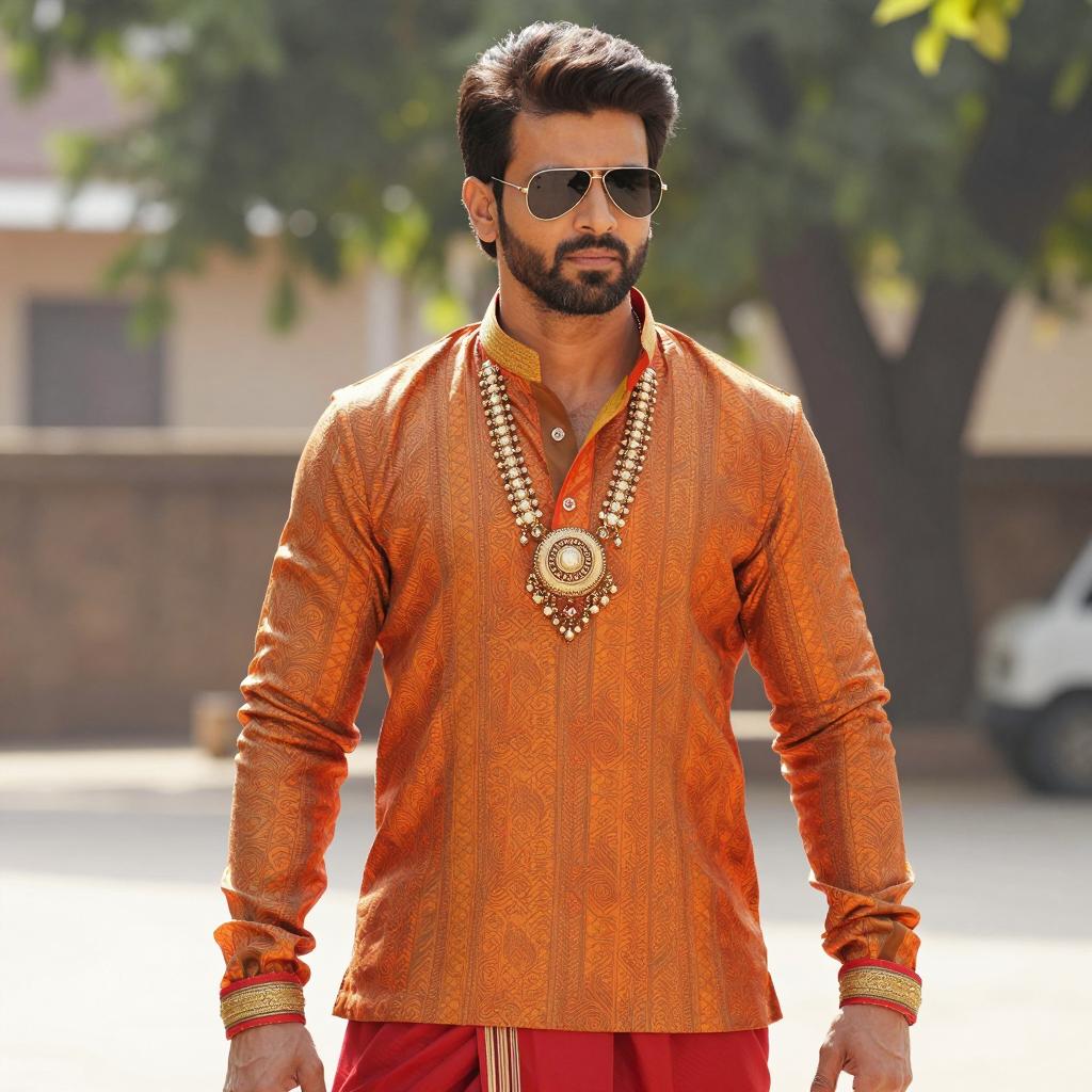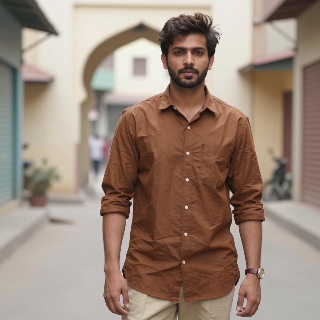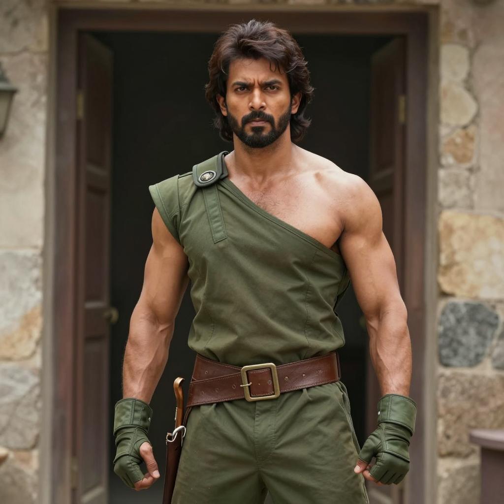 Bollywood film dress costume, photograph of a handsome Indian man with dark hair and beard, wearing a black traditional long kurta, standing in front of a stone archway, daytime, serious expression, slightly muscular build, medium skin tone, natural light, realistic style, subtle shadows, background shows old architectural details, full body shot, front view, casual attire, minimal accessories, medium shot