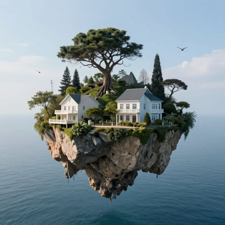 Photorealistic CGI image of a small, floating island in the ocean, featuring two white, two-story houses with gray roofs, surrounded by lush greenery, tall pine trees, and a large, sprawling tree. The rocky island base juts out over calm, blue ocean waters, with a clear, bright sky and a distant bird in flight. The houses have large windows and balconies, with a wooden deck connecting them, creating a serene, picturesque scene.