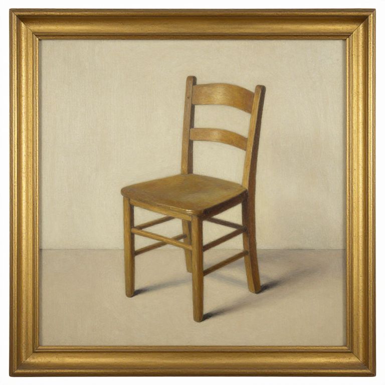 A minimalist still life oil painting on birch panel, showcasing a simple wooden chair against a neutral background, framed in a rustic gold frame, capturing the essence of French School realism with subtle lighting effects.