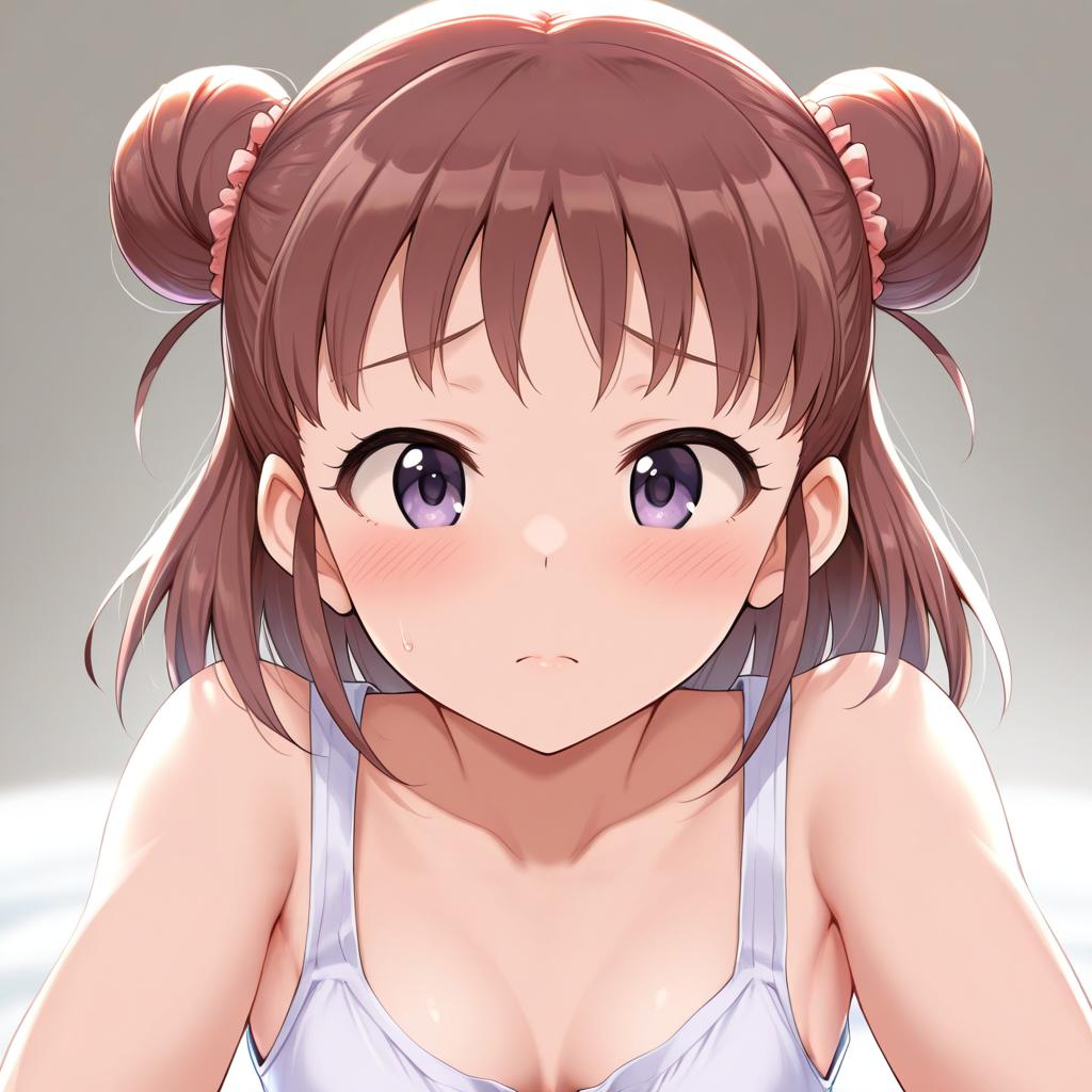Munakata atsumi, idolmaster, 1girl, purple eyes, brown hair, short hair, double bun, by artist ario, illustrious