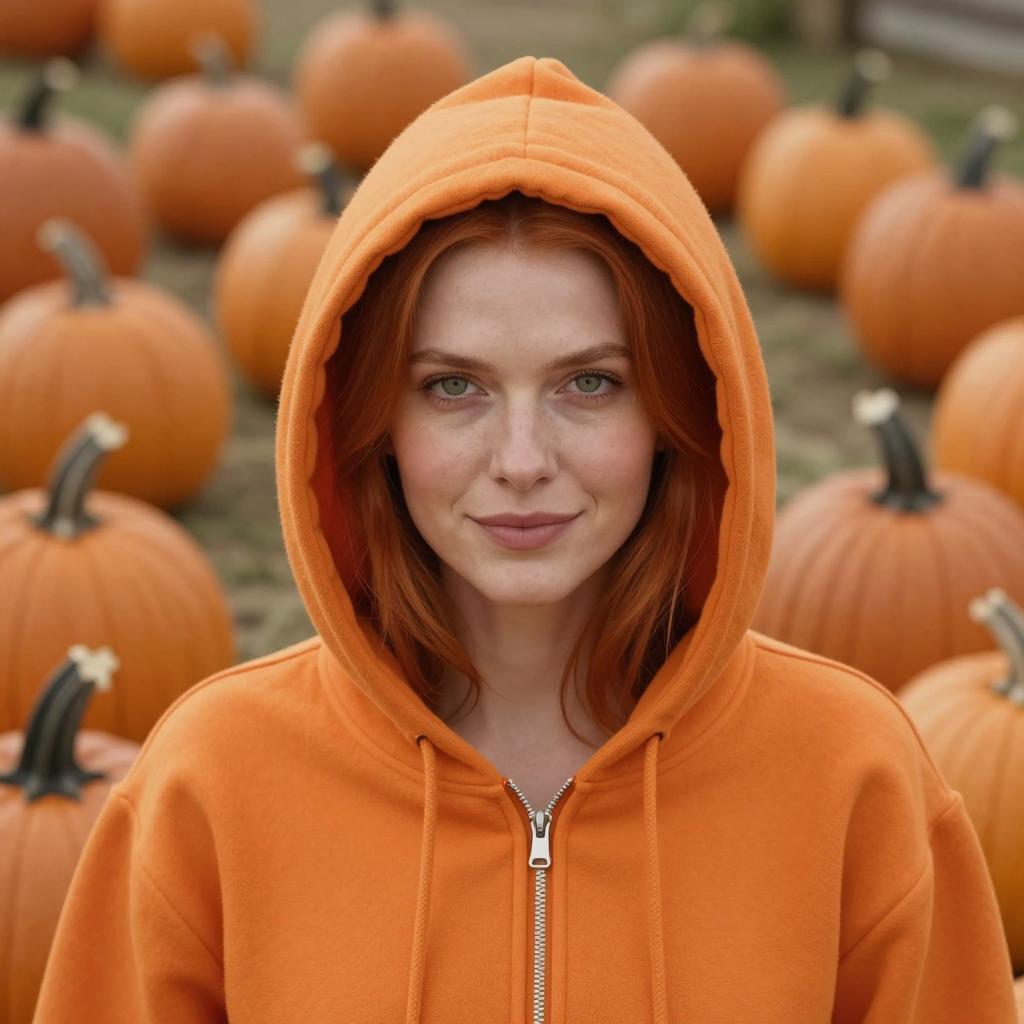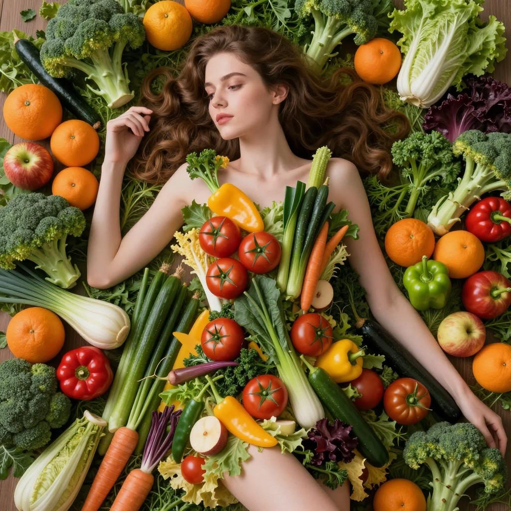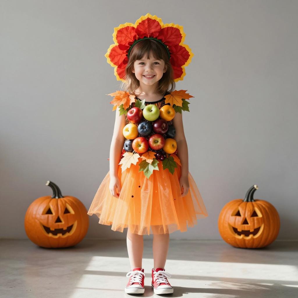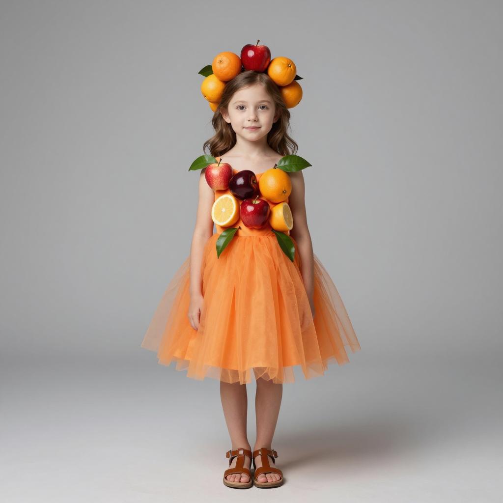 Fruit costume adult, photograph of a woman, wearing a bright red knitted hat with green leaves, surrounded by a costume made of oranges, apples, and blueberries, standing in an urban outdoor setting, daytime, clear sky, blurred background, woman has light skin and blue eyes, white shirt peeking from beneath fruit costume, hand partially visible, costume arranged in circular pattern, woman smiling, detailed fruit ures, street and building behind her, costume art, whimsical, colorful, realistic, casual, cityscape