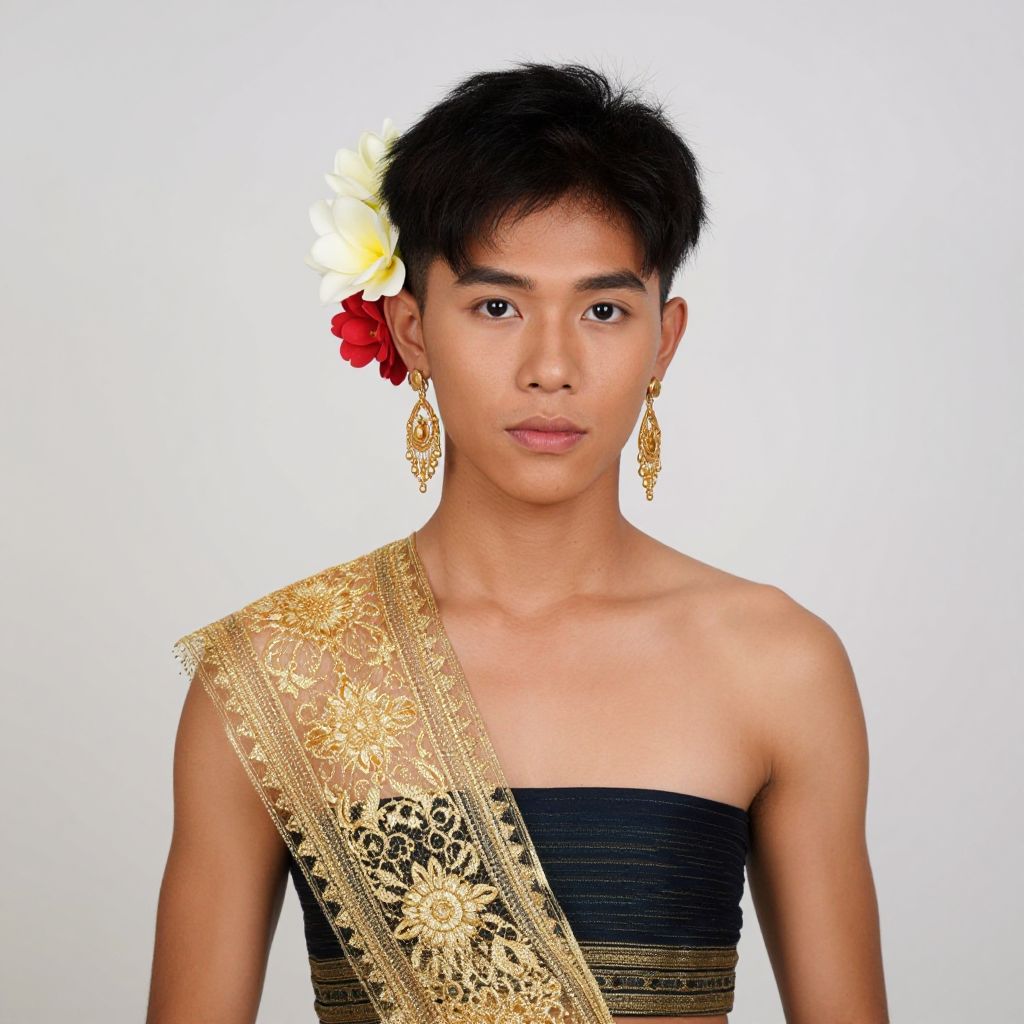 Photograph of a young Asian man with short black hair, wearing a black strapless top and a gold sash with intricate lace patterns draped over his right shoulder. He has a red hibiscus flower in his hair and gold dangling earrings. His expression is neutral, and he stands against a plain white background. The gold sash contrasts with his dark top, highlighting the ornate design. His skin tone is light brown, and he has a slim, toned physique. The overall composition is simple, focusing on his traditional attire and accessories.