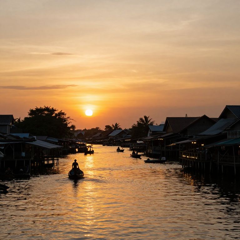 Photograph of a serene sunset over a narrow canal lined with traditional wooden stilt houses. The orange and yellow sun is low on the horizon, casting a warm, golden glow across the calm water. Silhouettes of people in small boats are visible, navigating the canal. Trees and palm leaves frame the background, adding to the tranquil atmosphere. The water reflects the sun's light, creating a shimmering path through the scene. The overall mood is peaceful and picturesque.